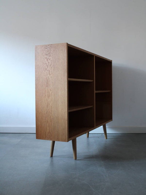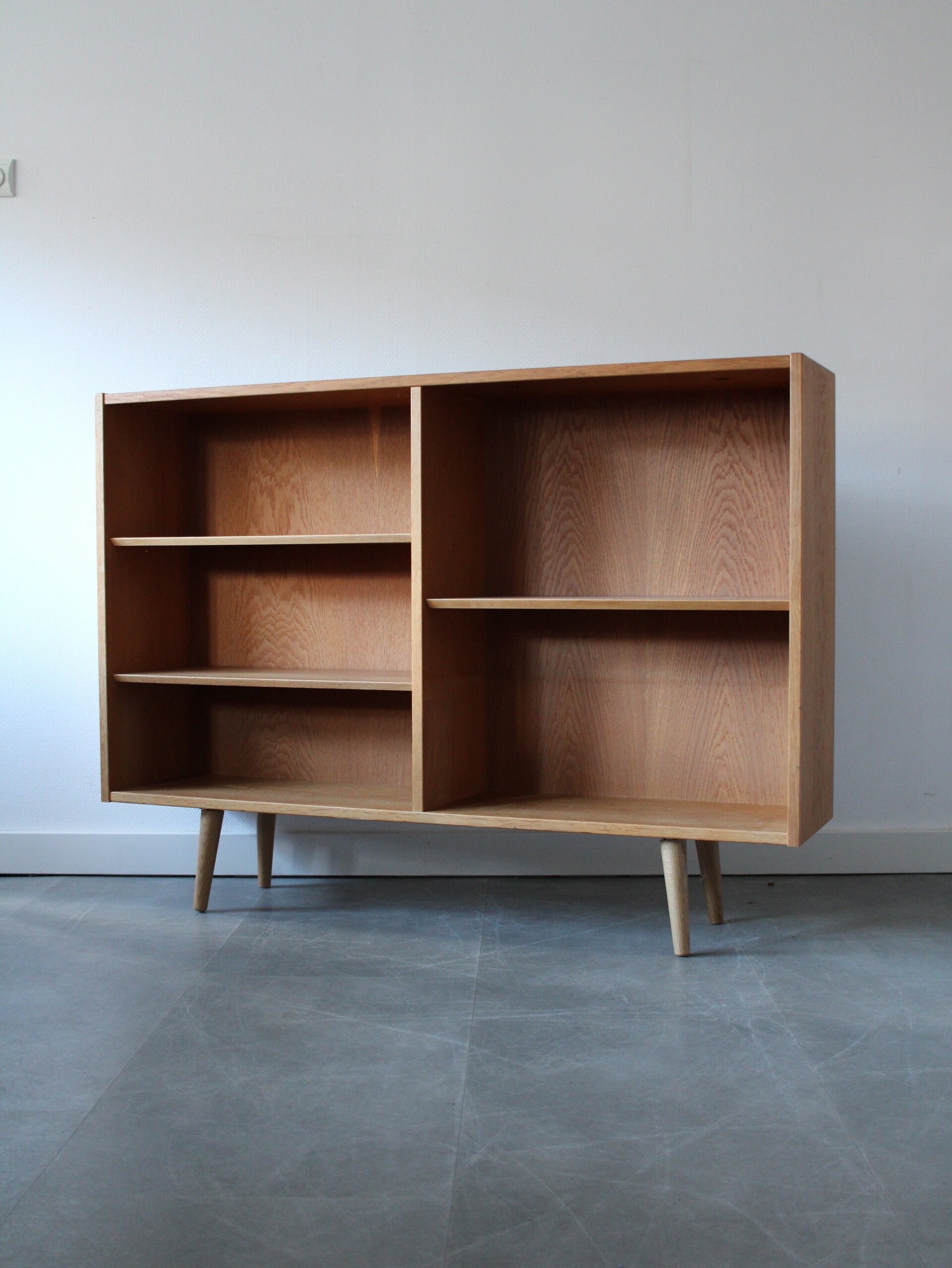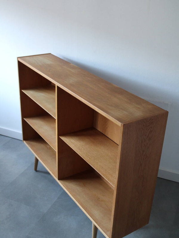 Vintage Deense boekenkast in eikenhout, vervaardigd door Brouer Møbelfabrik. Dit prachtige meubelstuk is een toonbeeld van Deens vakmanschap en tijdloos design. De boekenkast is vervaardigd uit hoogwaardig eikenhout, wat zorgt voor een frisse en lichte uitstraling. Het meubel beschikt over twee open vakken met daarin drie modulair te plaatsen legplanken.