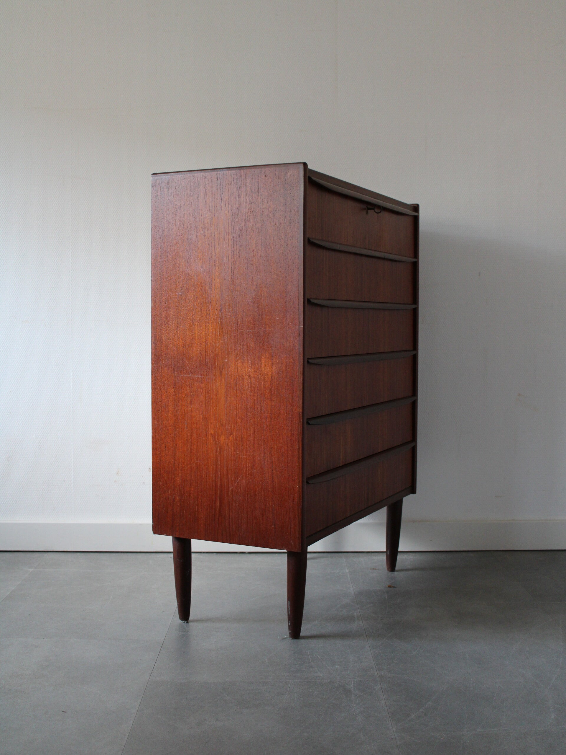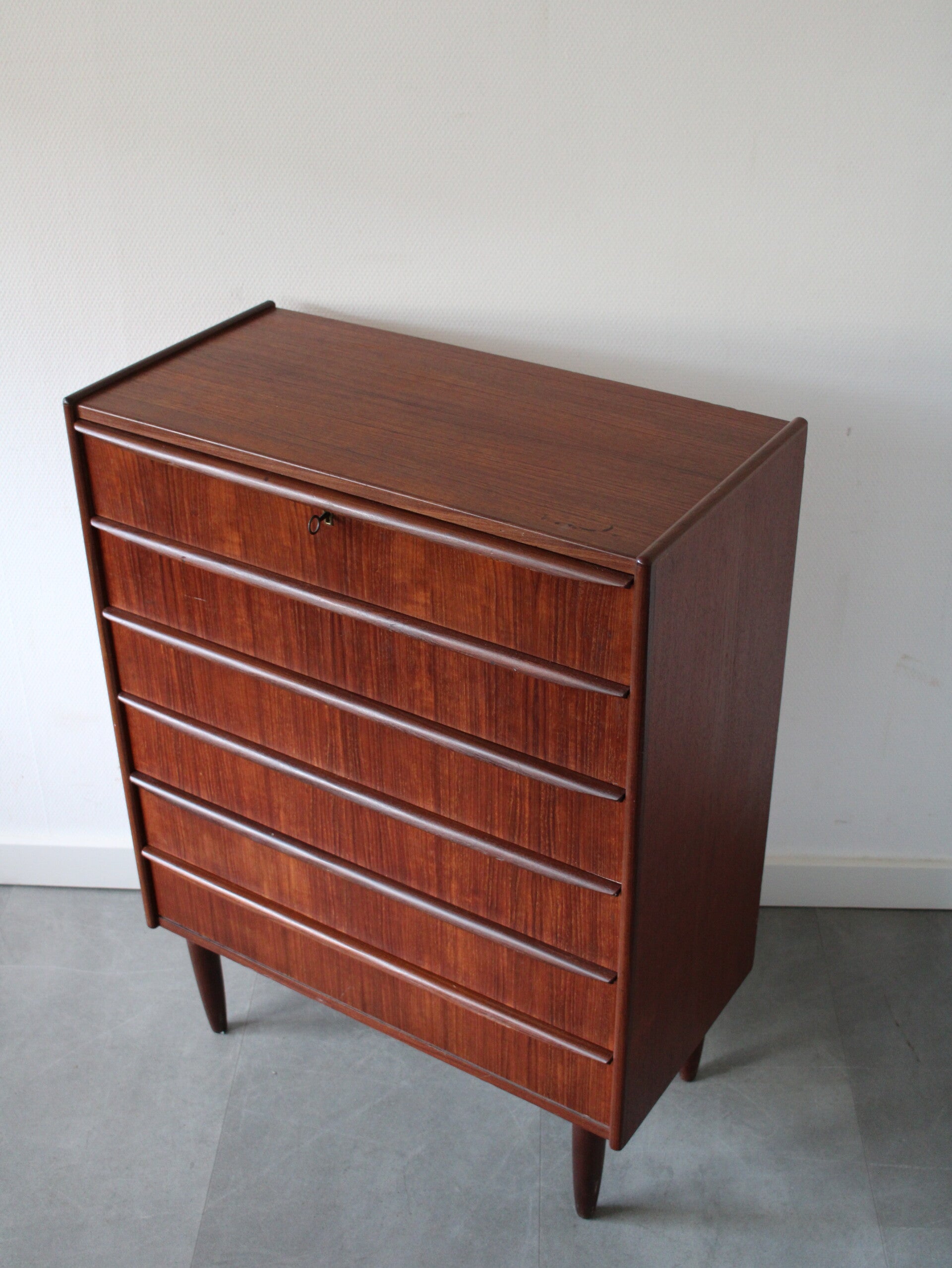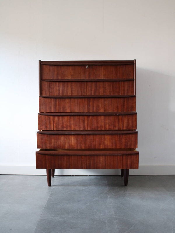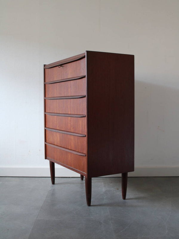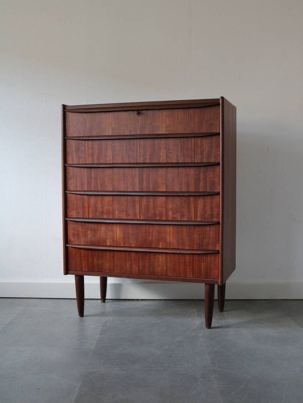 Vintage ladekast in teak geproduceerd in Denemarken. De ladekast is geproduceerd in de jaren 60 van de vorige eeuw en komt rechtstreeks uit het land van herkomst. De ladekast heeft maar liefst 6 goed schuivende lades met massieve houten grepen, strak vormgegeven. Het geheel staat stevig op zijn taps toelopende poten.