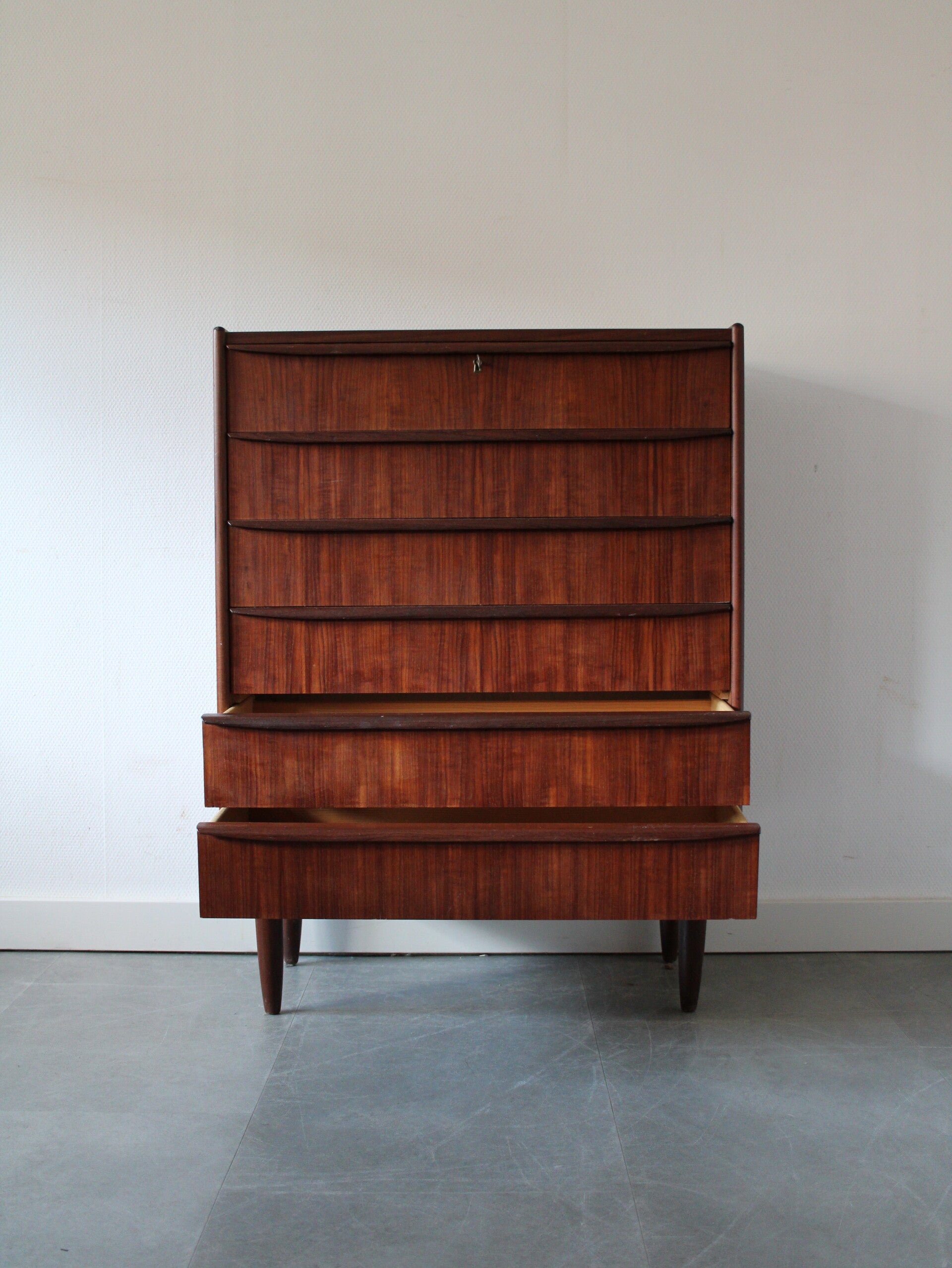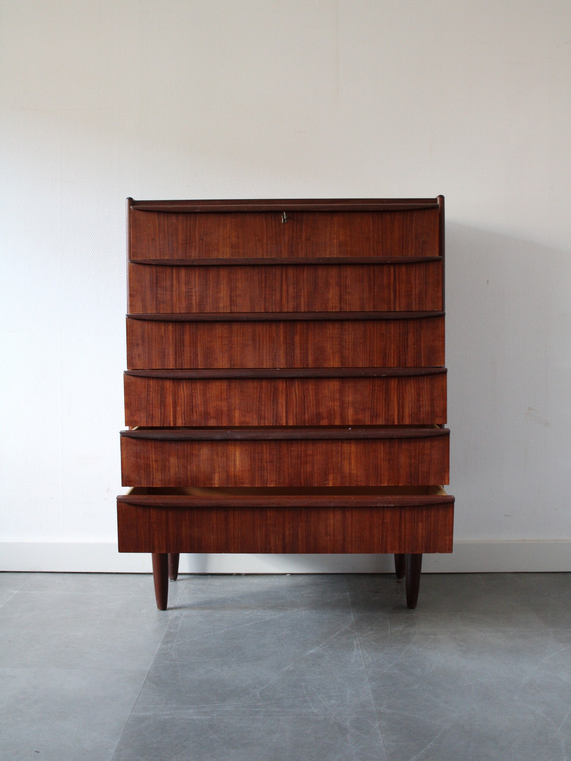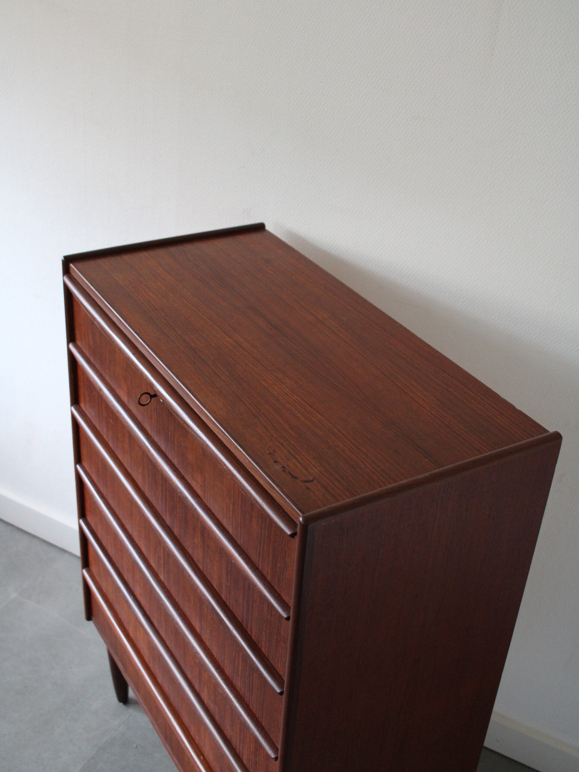 Vintage ladekast in teak geproduceerd in Denemarken. De ladekast is geproduceerd in de jaren 60 van de vorige eeuw en komt rechtstreeks uit het land van herkomst. De ladekast heeft maar liefst 6 goed schuivende lades met massieve houten grepen, strak vormgegeven. Het geheel staat stevig op zijn taps toelopende poten.