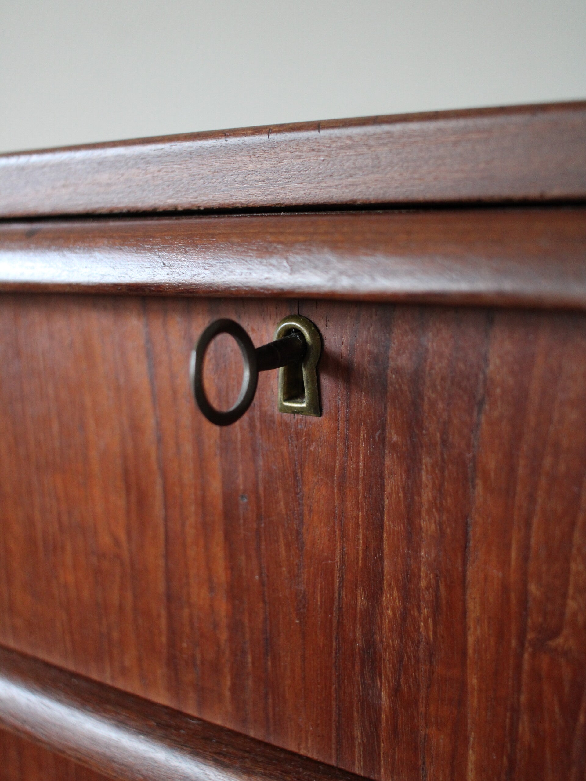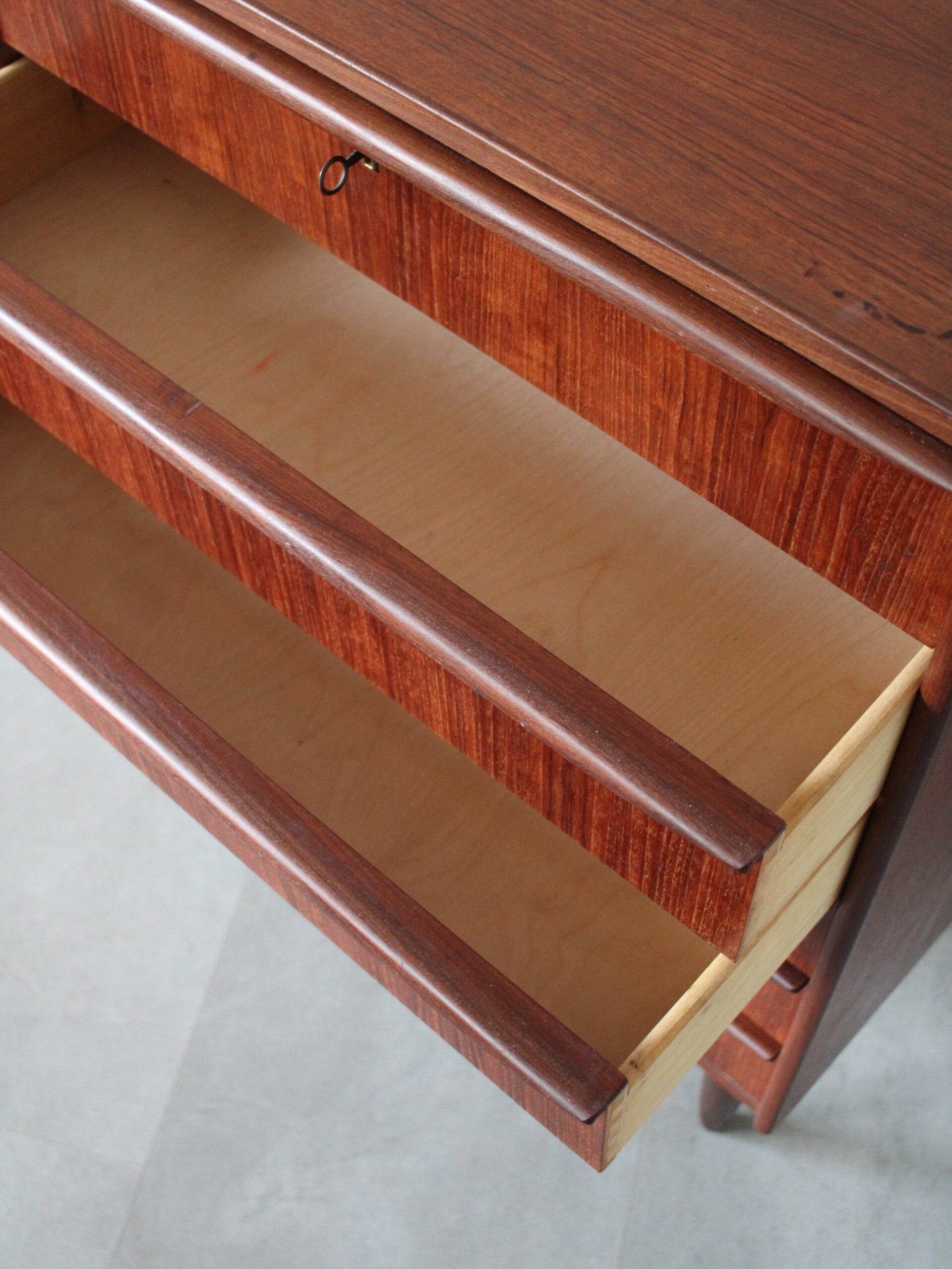 De ladekast is gepoetst en in een passende Deense olie gezet. Vervolgens wederom goed gepoetst. De ladekast heeft weinig tot geen gebruikerssporen.