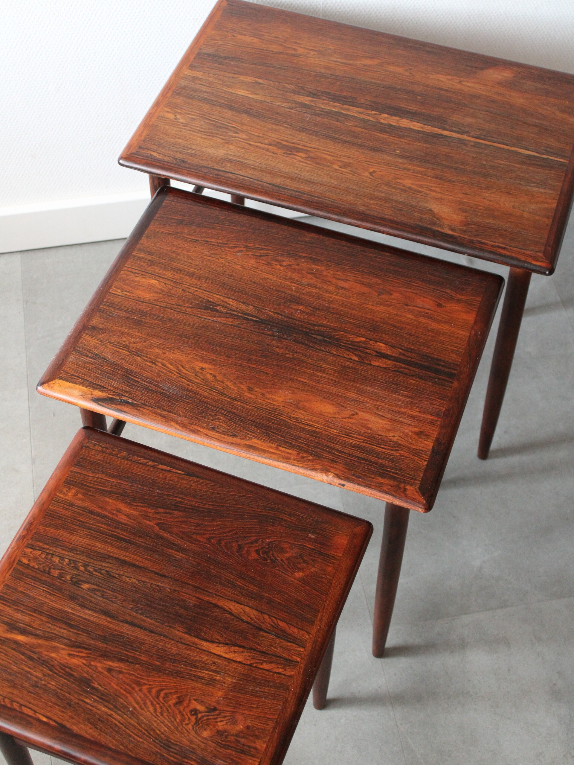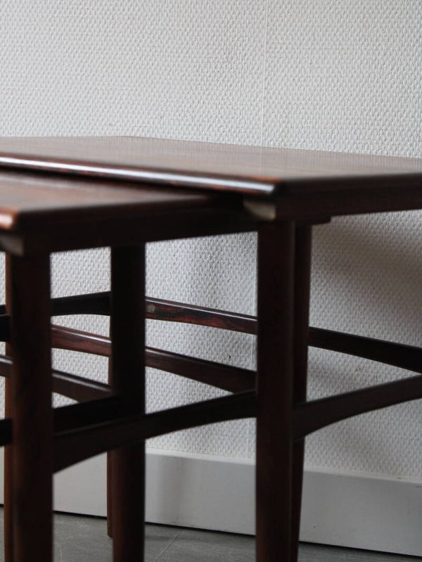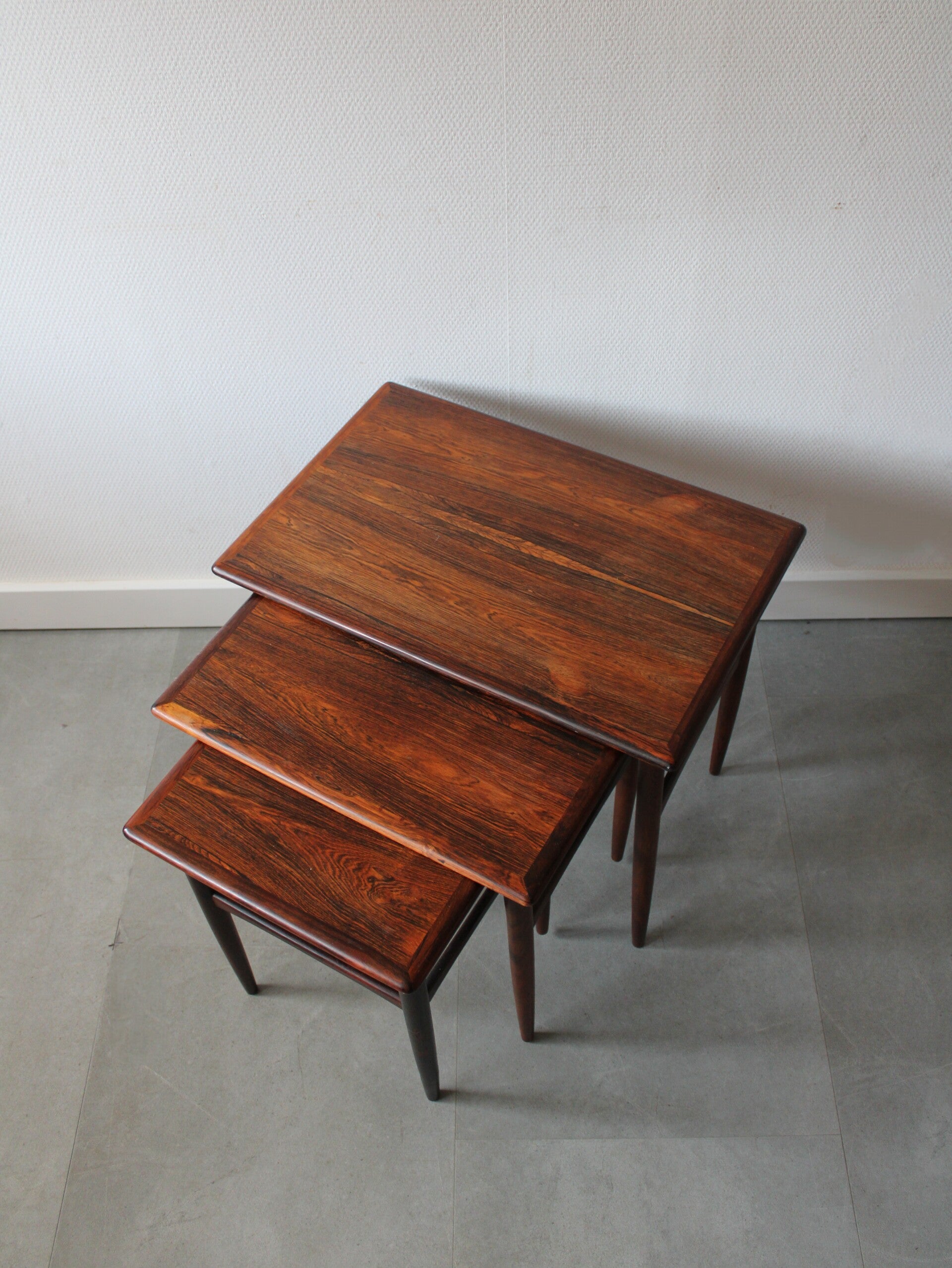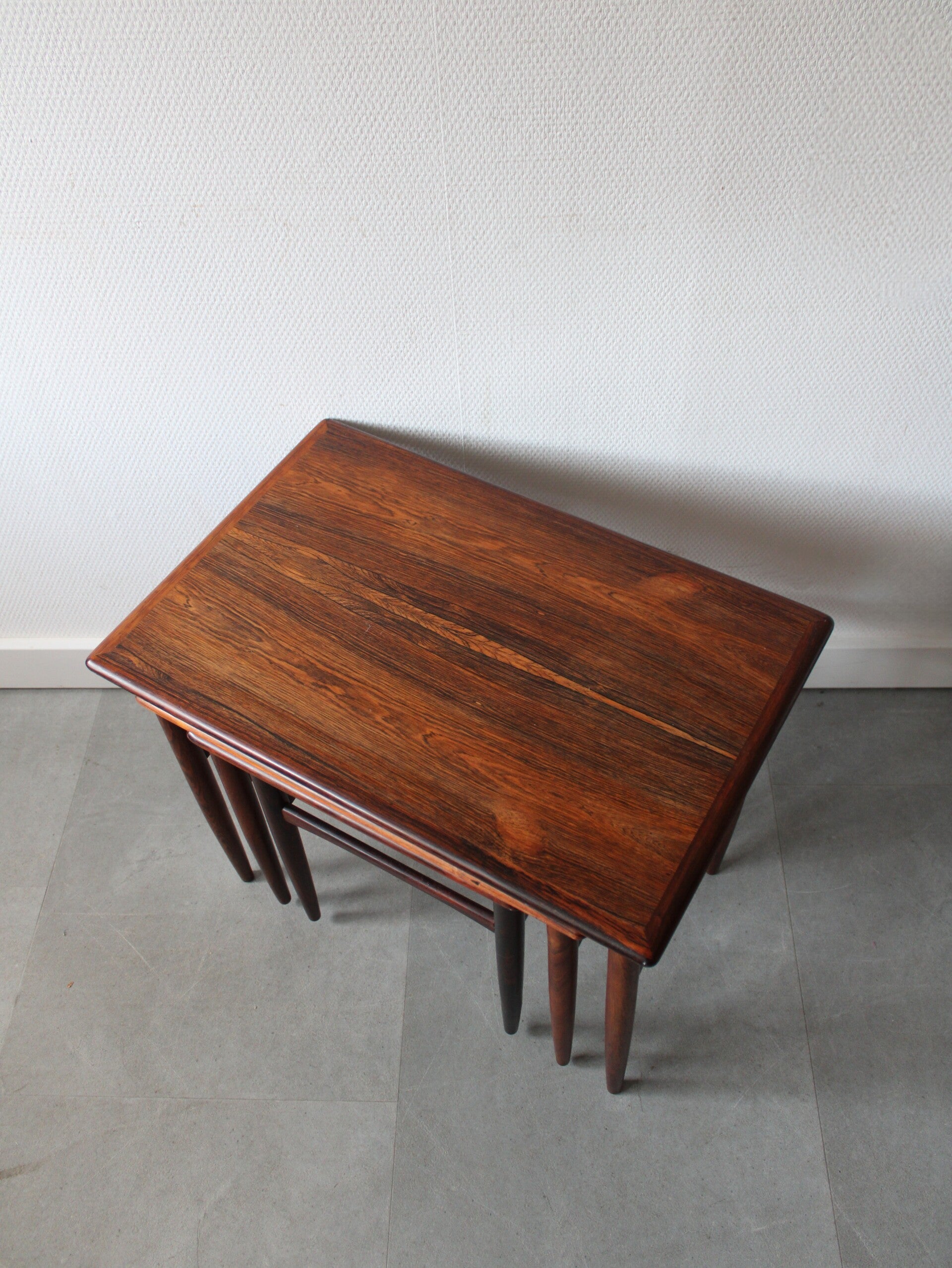 Vintage Deense mimiset/nesting tables in palissander ontworpen door vermoedelijk Arne Hovmand Olsen of Kai Kristiansen ontworpen. Dezelfde mimiset wordt door verschillende vintage dealers aangeboden onder de naam van Olsen en Kristiansen.