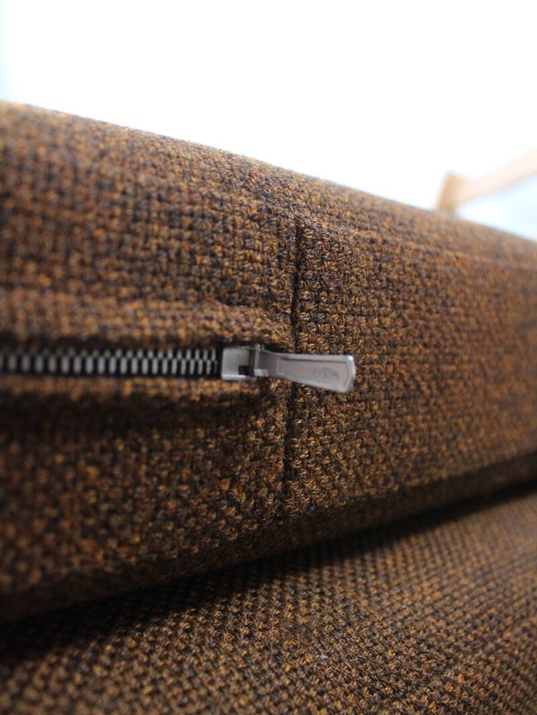 De bank heeft een stevig frame van massief eikenhout, dat volledig is opgefrist, gepoetst en in de olie gezet. De bekleding is hoogstwaarschijnlijk origineel en uitgevoerd in een bruine stof die prachtig contrasteert met het lichte hout. De stof verkeert in nette staat en draagt bij aan het authentieke karakter van het meubel.