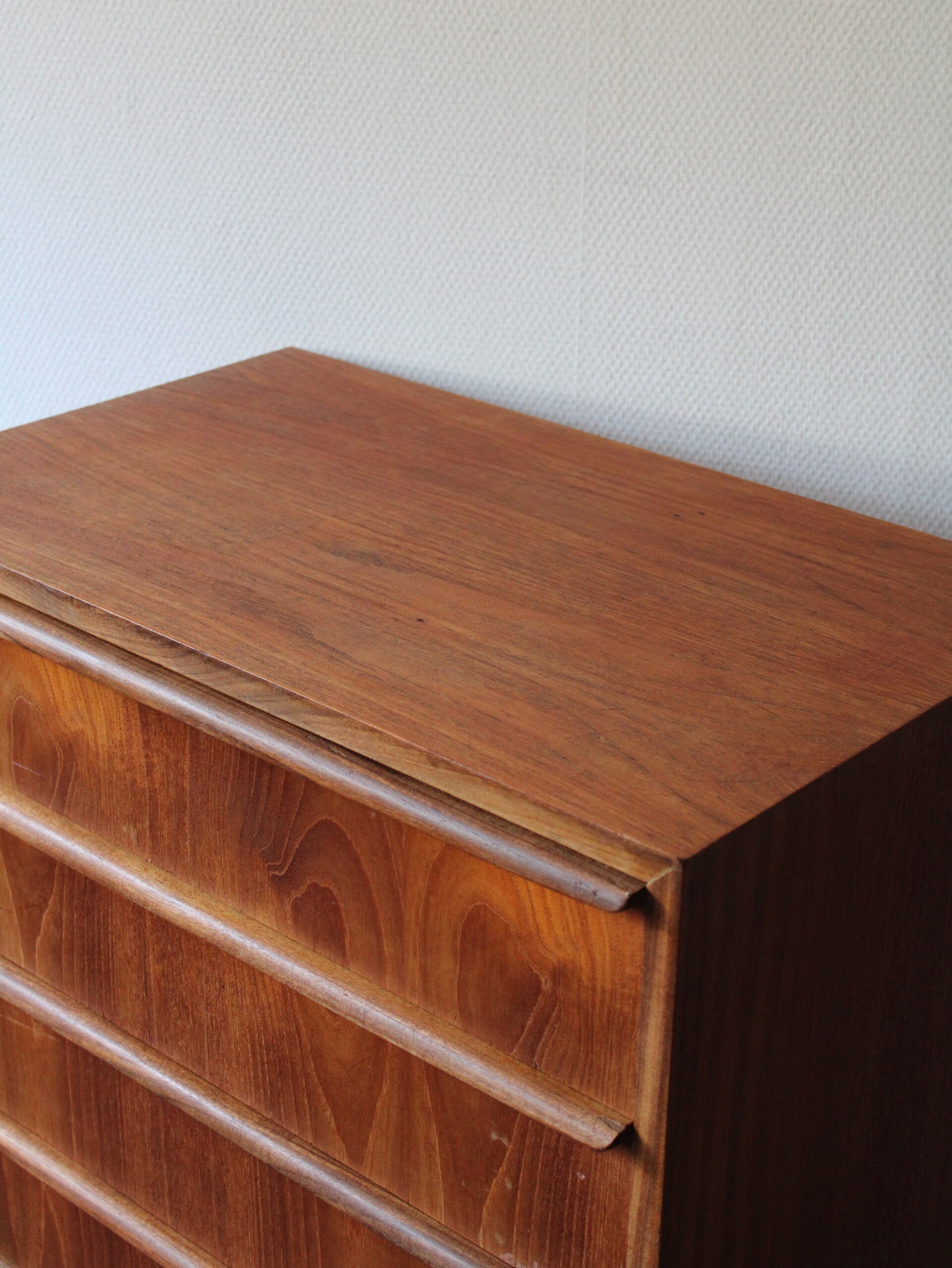 Vintage ladekast in teak geproduceerd in Denemarken. De ladekast is geproduceerd in de jaren 60 van de vorige eeuw en komt rechtstreeks uit het land van herkomst. De ladekast heeft maar liefst 6 goed schuivende lades met massieve houten grepen, strak vormgegeven. Het geheel staat stevig op zijn taps toelopende poten.