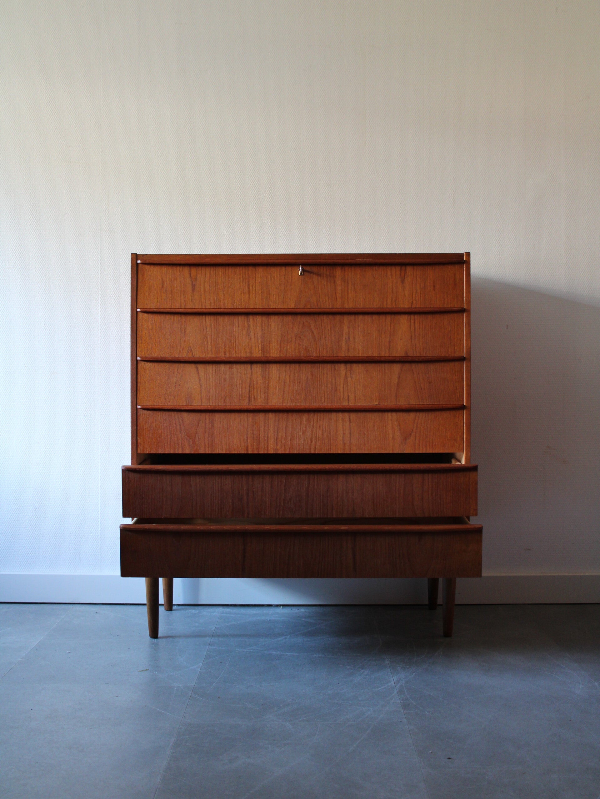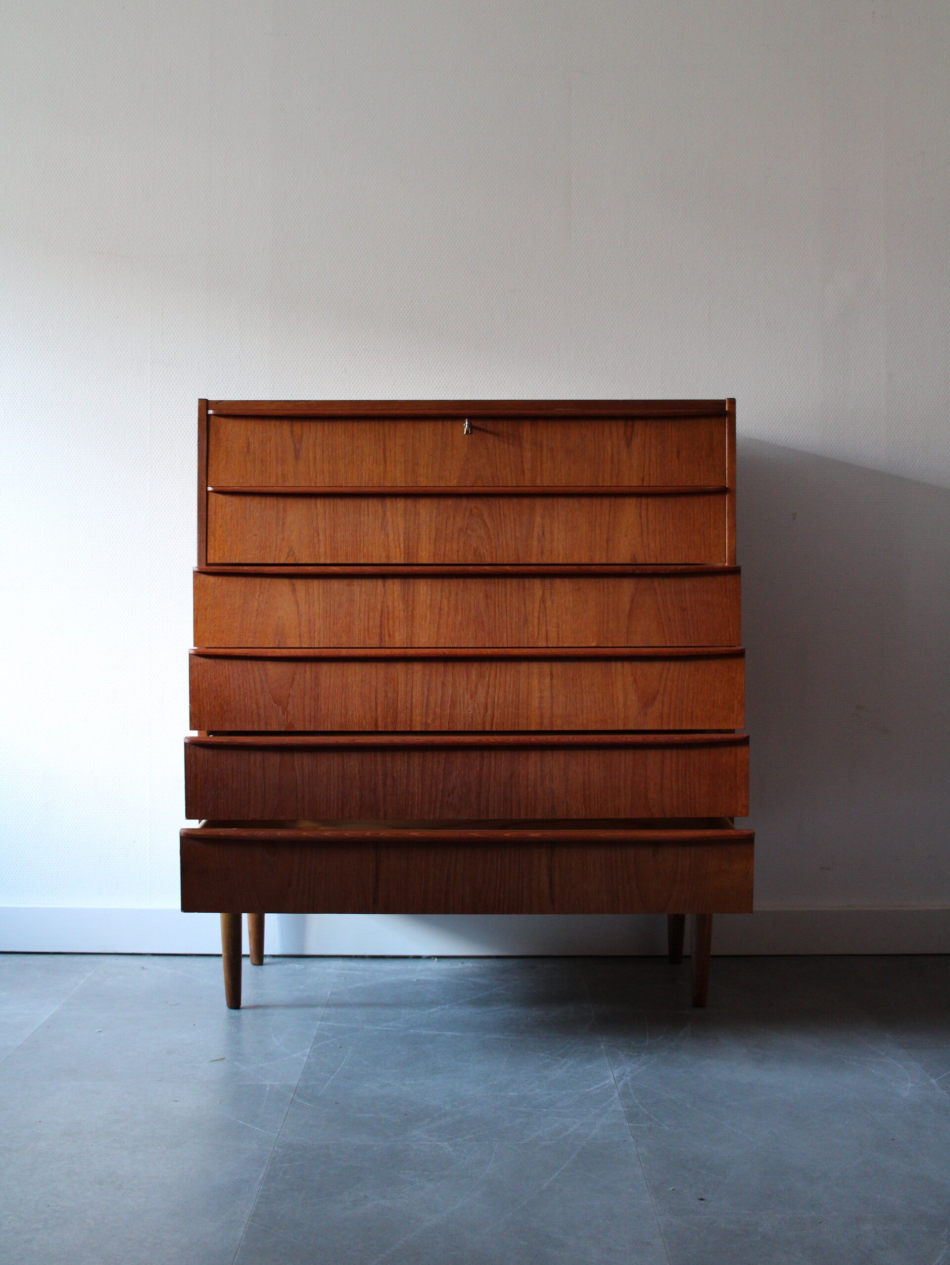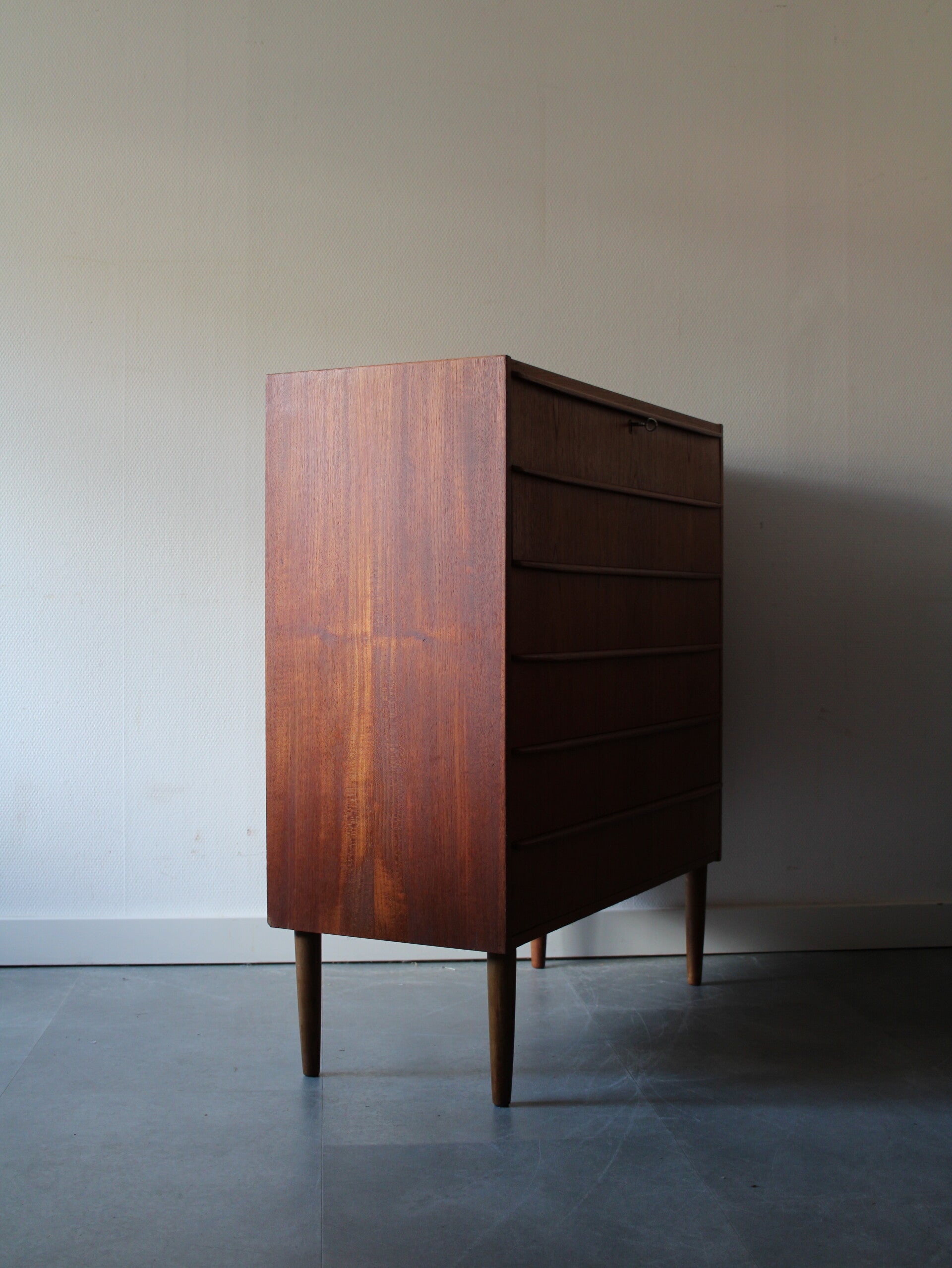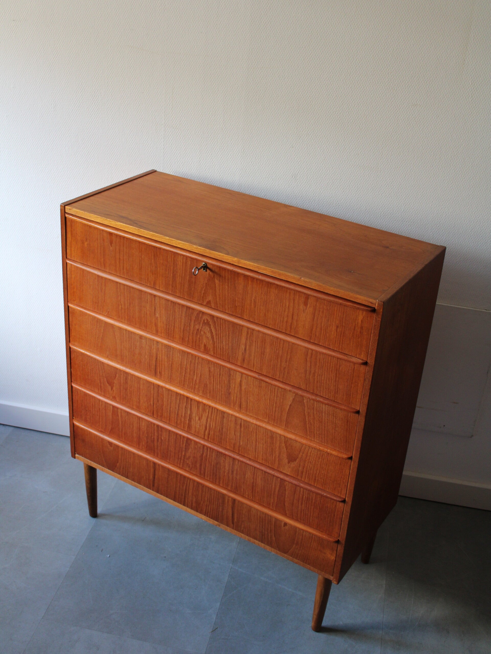 Vintage ladekast in teak geproduceerd in Denemarken. De ladekast is geproduceerd in de jaren 60 van de vorige eeuw en komt rechtstreeks uit het land van herkomst. De ladekast heeft maar liefst 6 goed schuivende lades met massieve houten grepen, strak vormgegeven. Het geheel staat stevig op zijn taps toelopende poten.