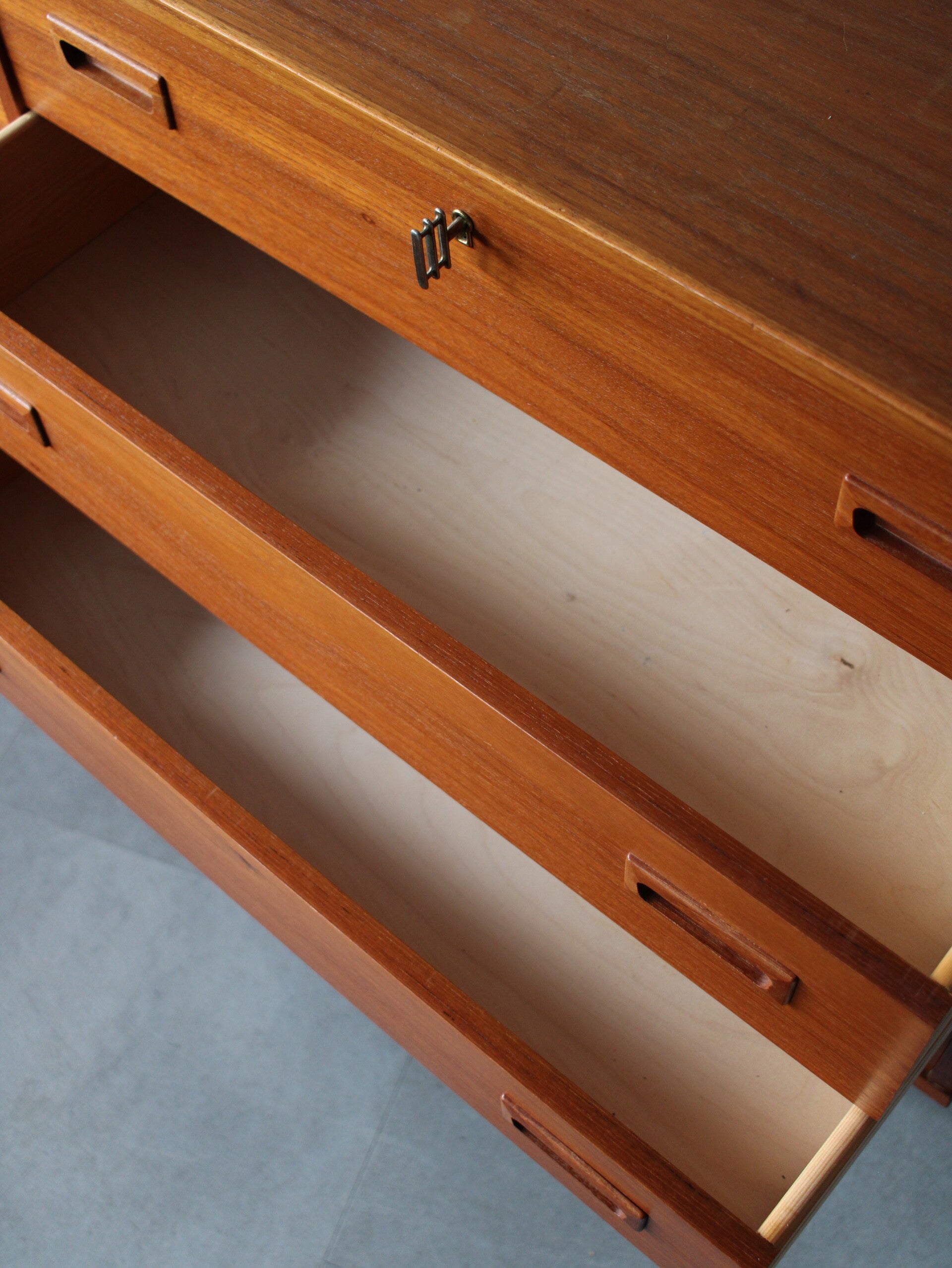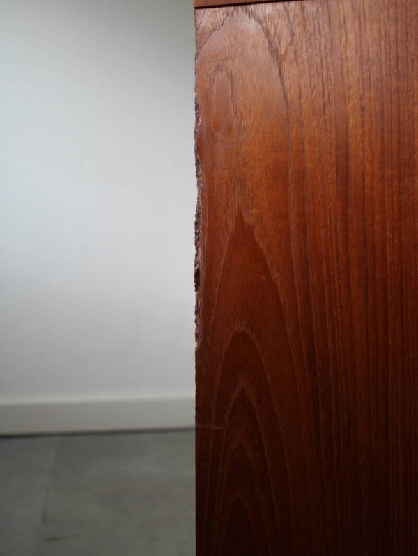 Het meubel is volledig gepoetst en behandeld met Deense olie, waardoor de natuurlijke diepte en glans van het teak weer schitterend naar voren komen. De kast verkeert in goede vintage staat, met gebruikssporen passend bij de leeftijd.