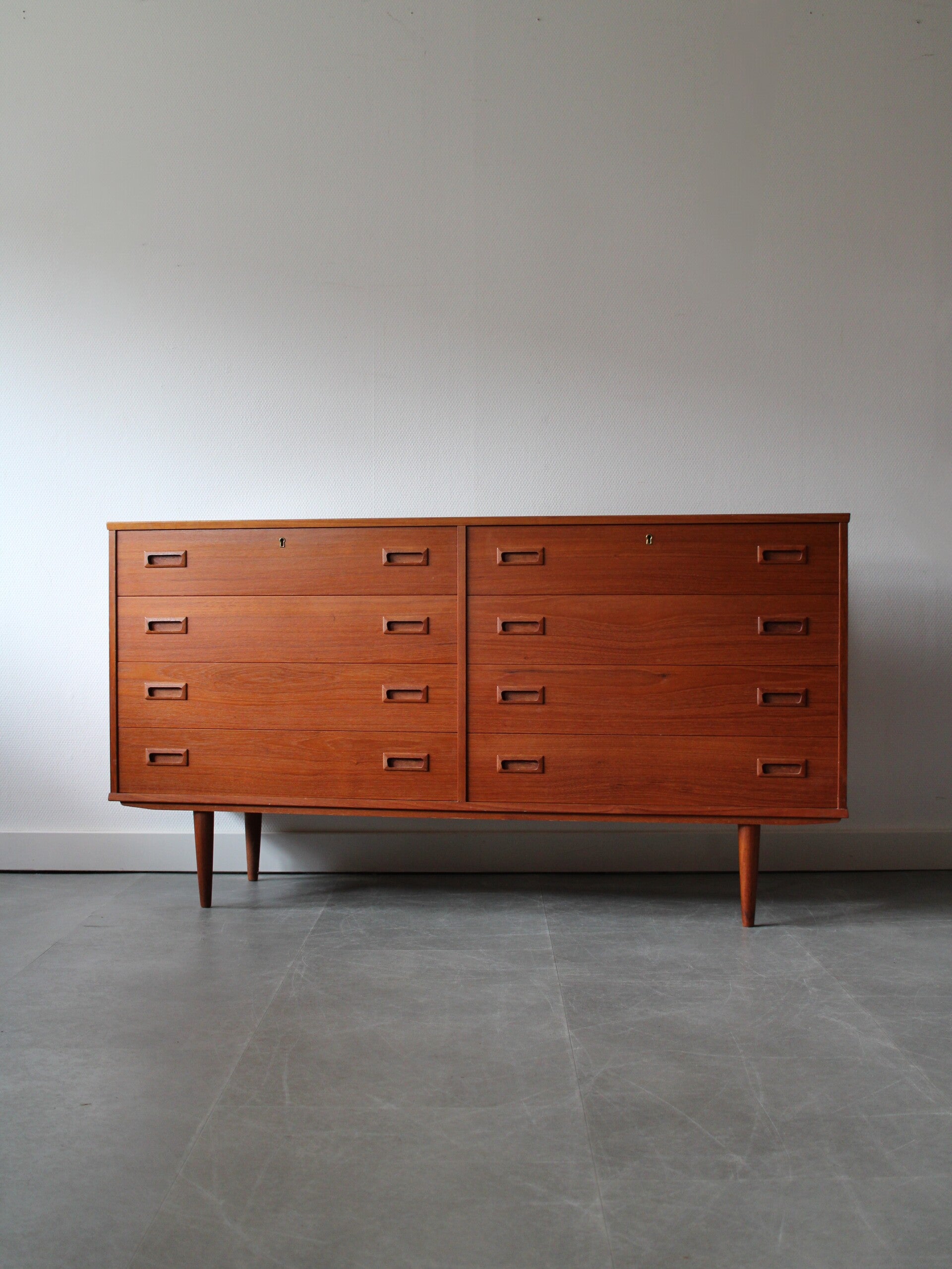 De ladekast beschikt over tien ruime lades, symmetrisch verdeeld over twee kolommen. De verzonken handgrepen en het strakke lijnenspel geven het meubel een elegante, minimalistische uitstraling. De kast rust op slanke, taps toelopende poten en is uitgevoerd in warm teakfineer met een prachtige houtnerf.