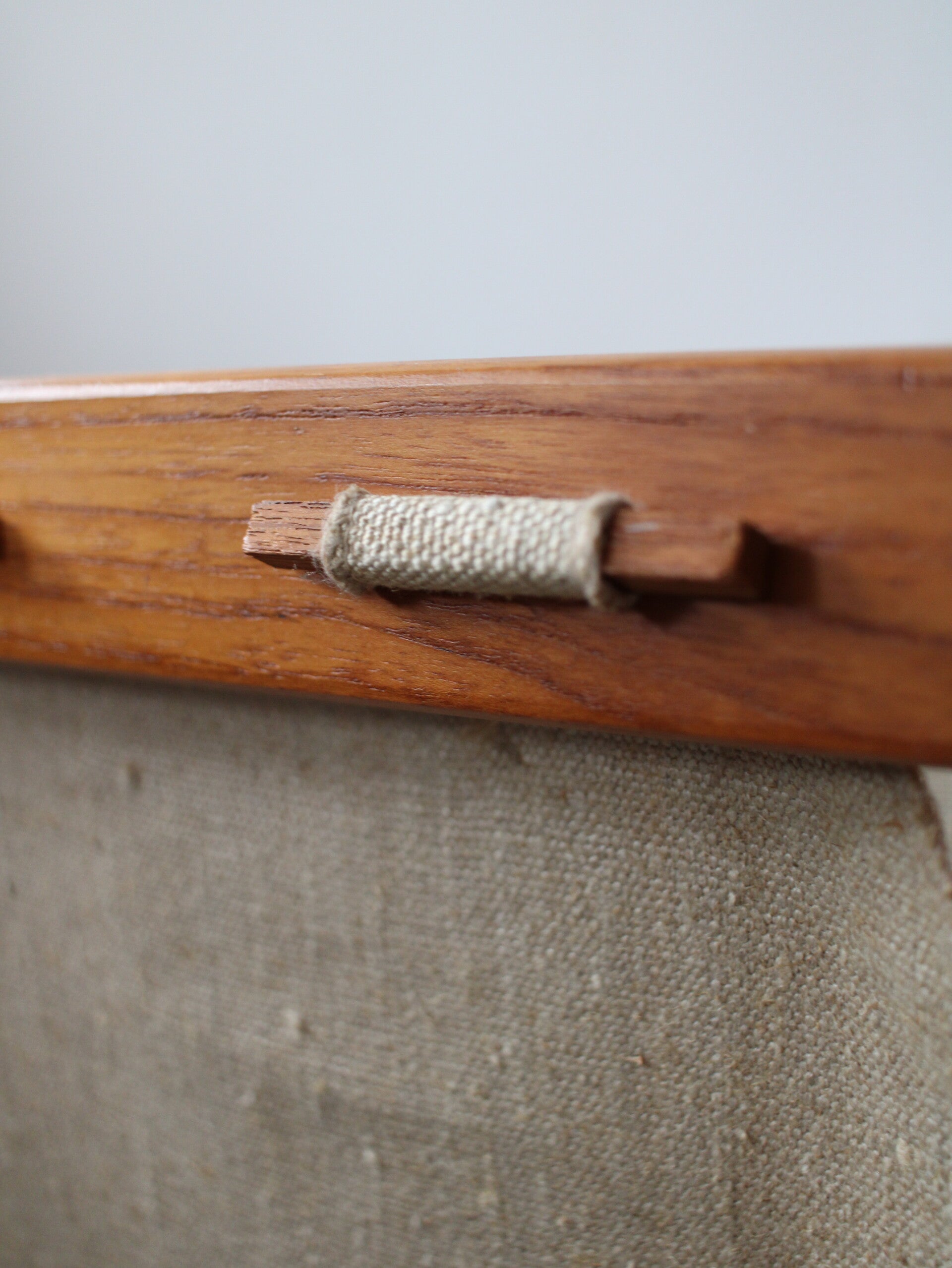 Het frame is gemaakt van massief teak met een warme glans en afgeronde hoeken: typisch Scandinavisch design. Onder het blad hangt een linnen opbergvak, ideaal voor tijdschriften of kleine accessoires.