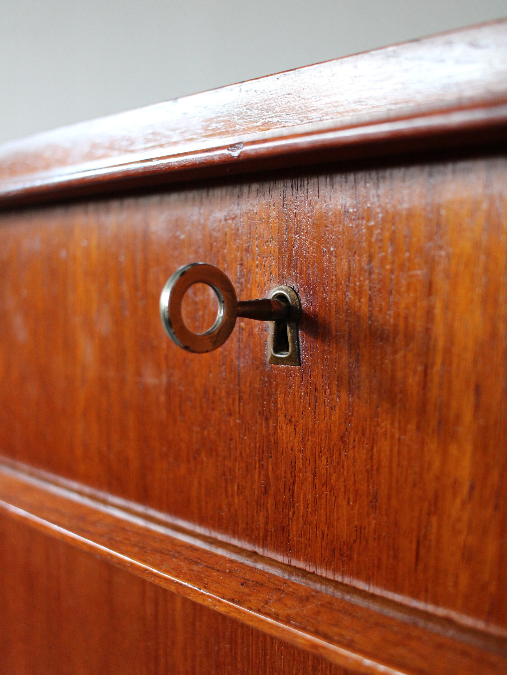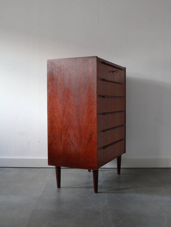 Vintage ladekast in teak geproduceerd in Denemarken. De ladekast is geproduceerd in de jaren 60 van de vorige eeuw en komt rechtstreeks uit het land van herkomst. De ladekast heeft maar liefst 6 goed schuivende lades met massieve houten grepen, strak vormgegeven. Het geheel staat stevig op zijn taps toelopende poten.