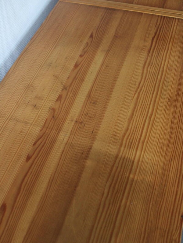 Het systeem bestaat uit massief grenen panelen met een warme, honingkleurige tekening, gecombineerd met strak vormgegeven zwarte metalen plankdragers. De herkenbare witte IKEA-scharnieren, kenmerkend voor deze periode, tonen de originele detaillering uit de jaren voordat IKEA wereldwijd ging standaardiseren.
