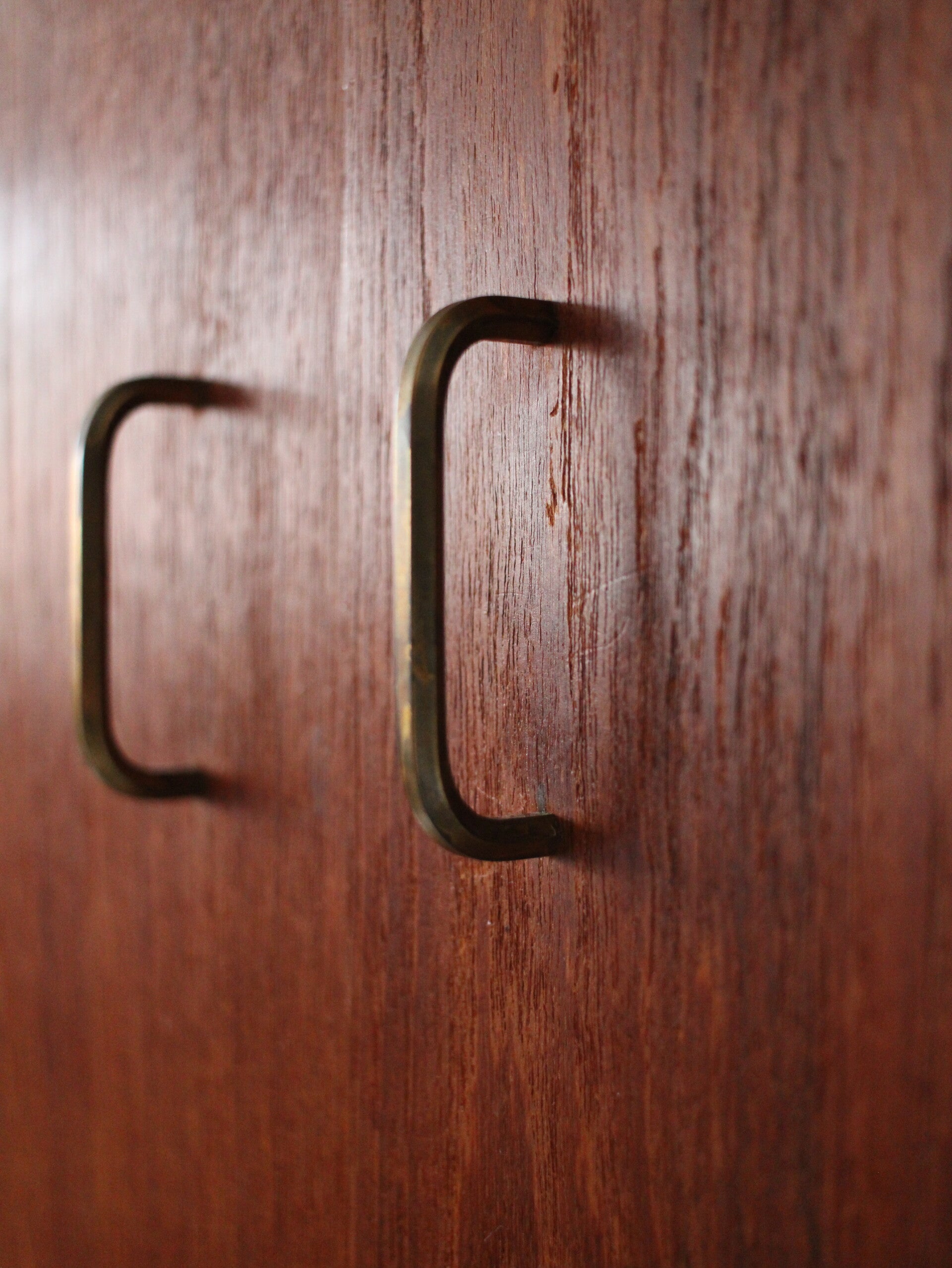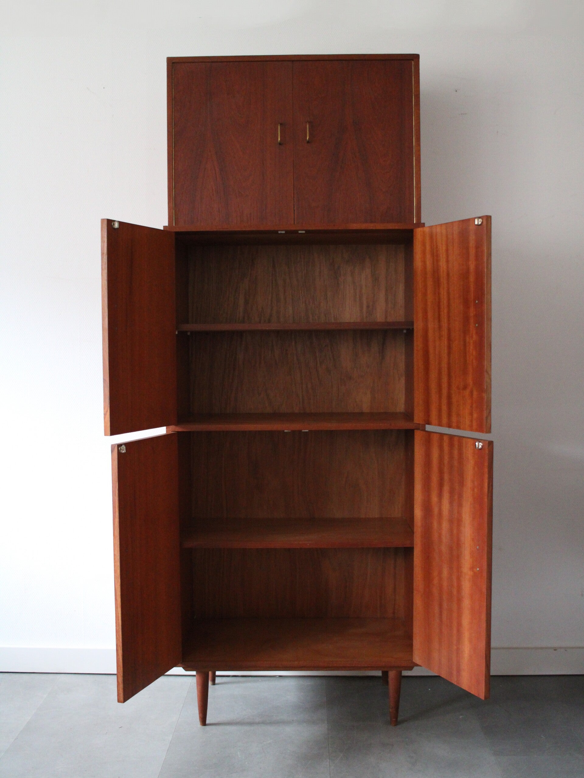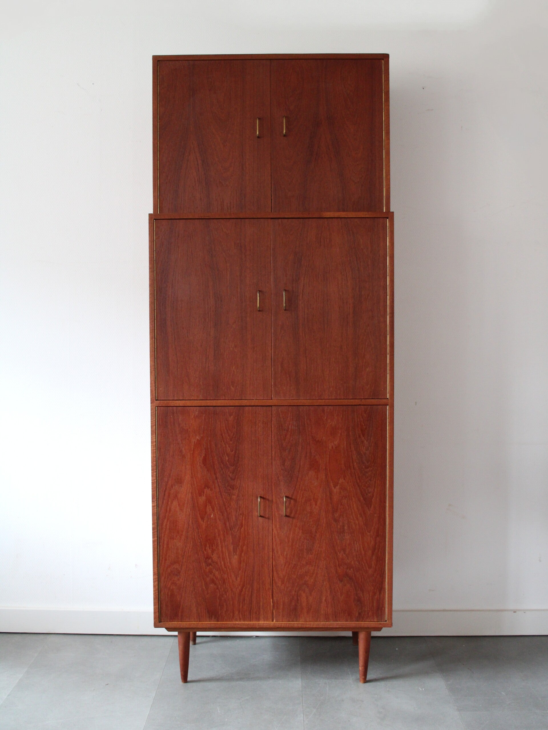 Vintage hoge opbergkast in teakfineer uit de jaren ’60/’70. De kast is opgebouwd uit drie compartimenten met dubbele deuren en slanke messing greepjes. Dankzij de strakke belijning en de taps toelopende poten heeft het geheel een tijdloze Mid-Century Modern uitstraling.