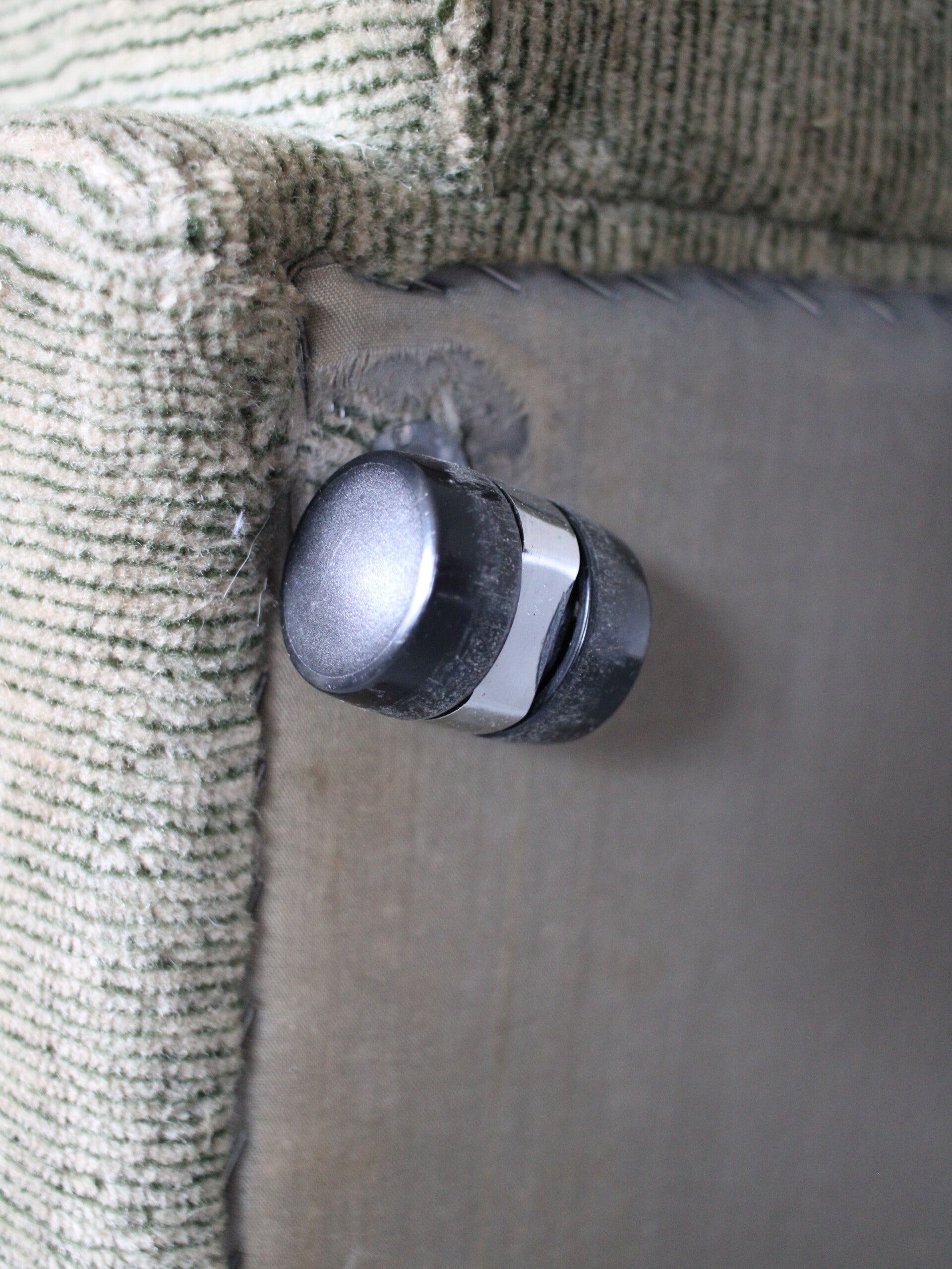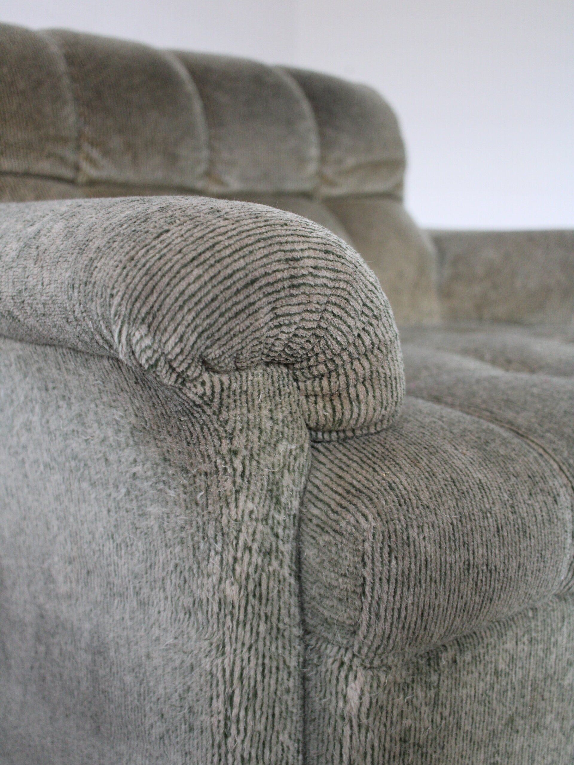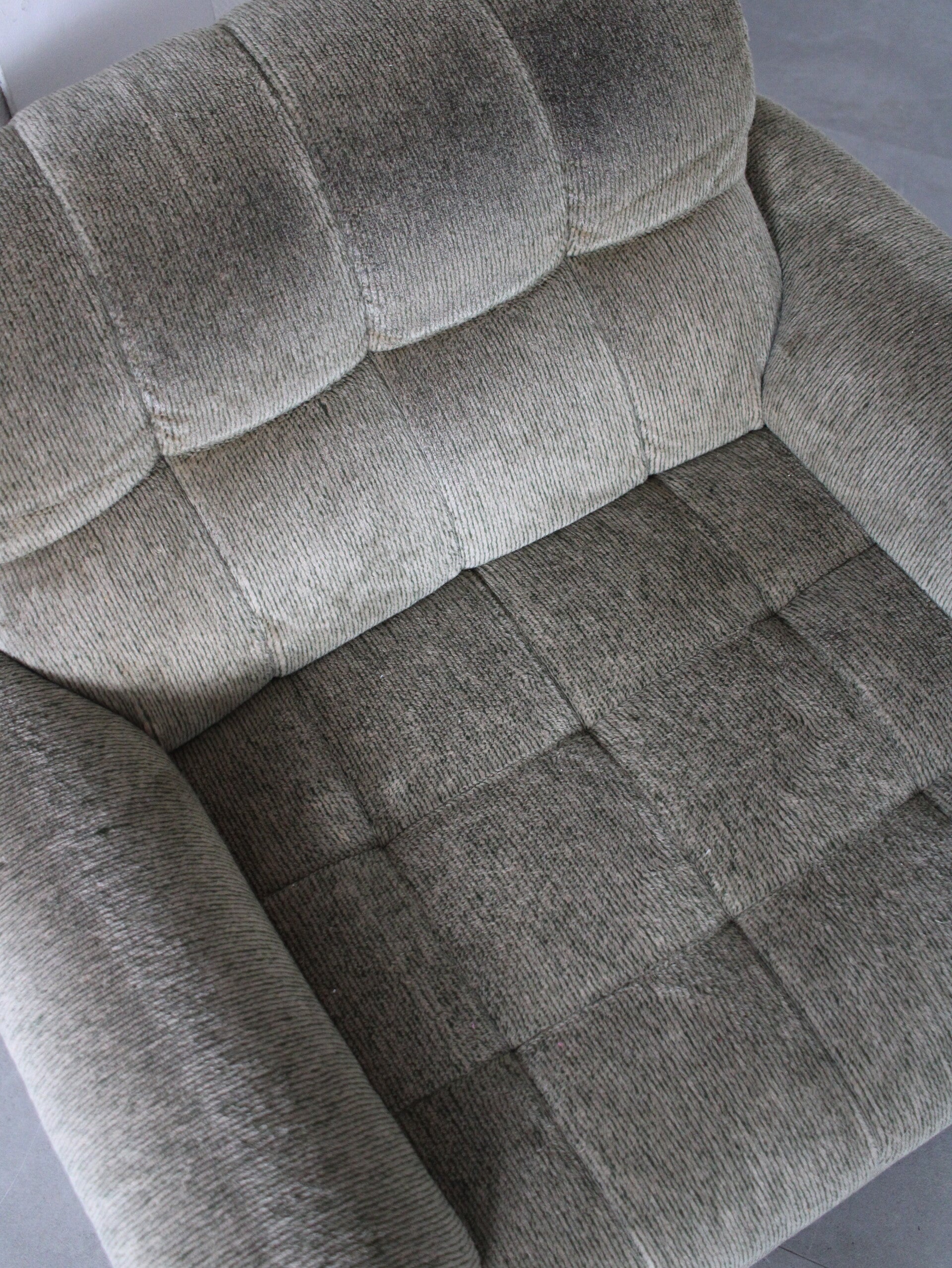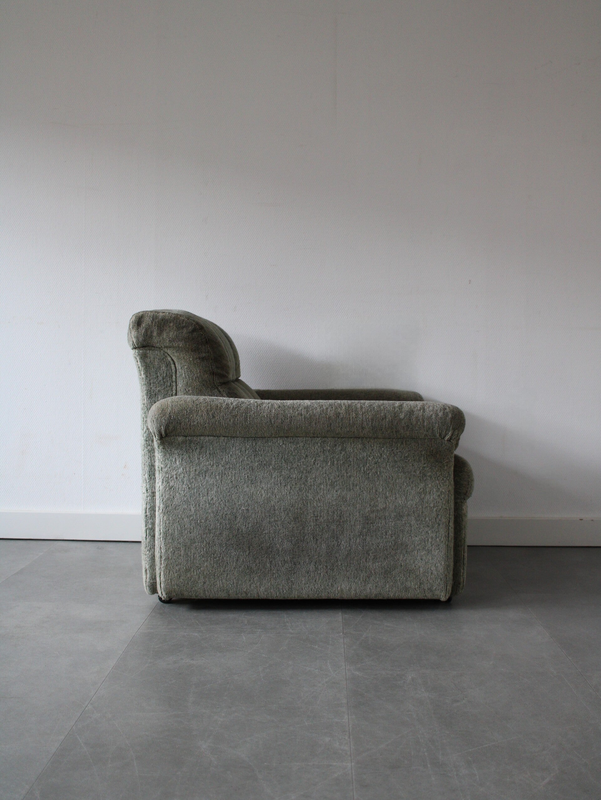 De fauteuil is uitgevoerd in een robuuste, zacht geribbelde chenilleachtige stof in warm mosgroen: typisch voor Duitse premiumzitmeubels uit deze periode. De royale armrollen, diepe zit en de herkenbare gecapitonneerde rugpartij geven het geheel die uitnodigende lounge-uitstraling die men ook ziet bij veel vermoedelijke Lausser-modellen.