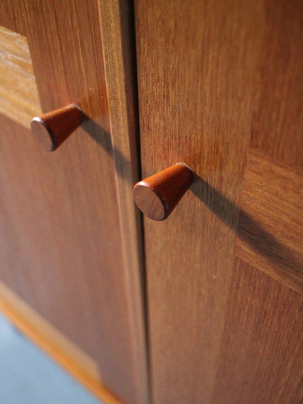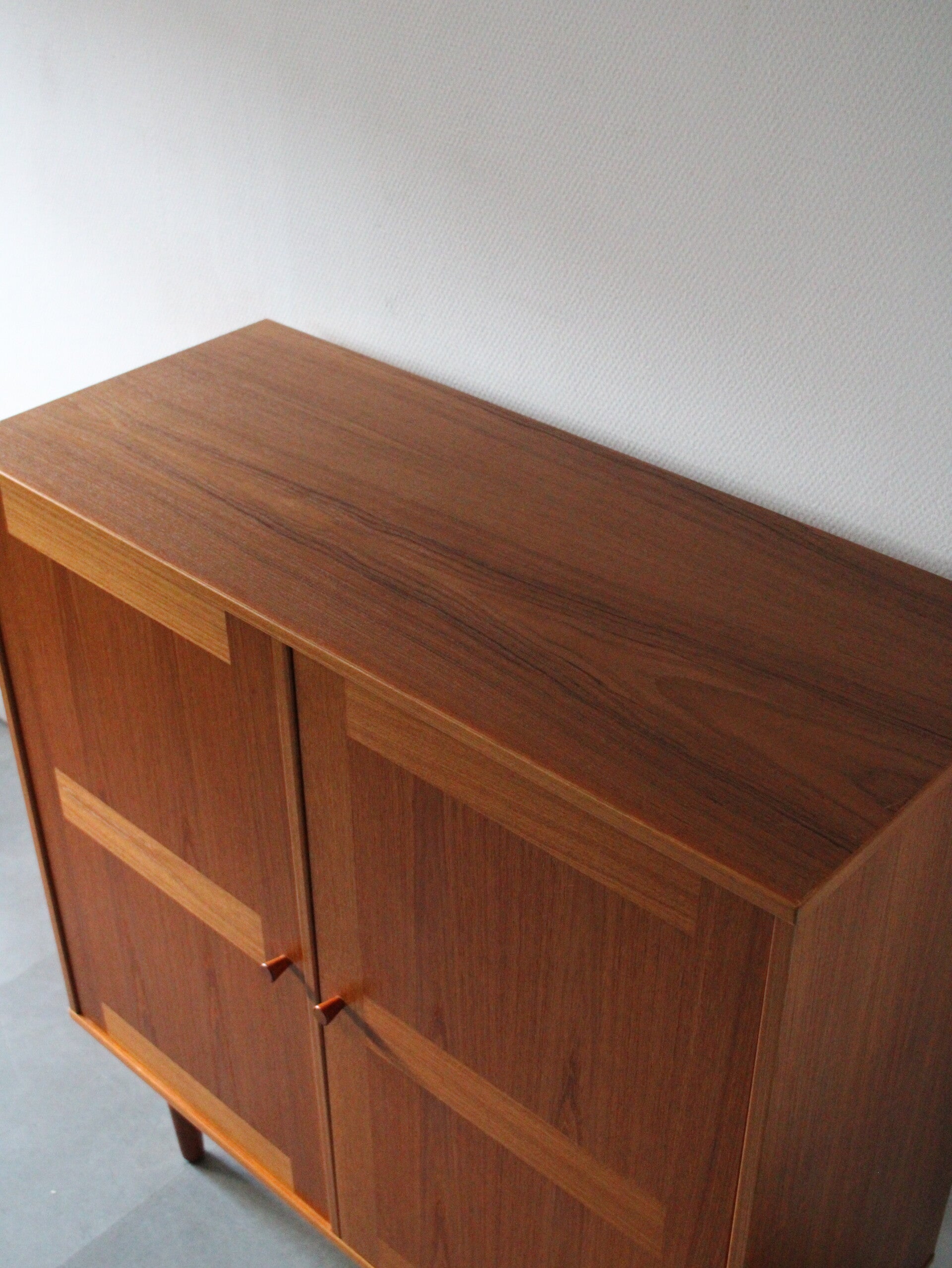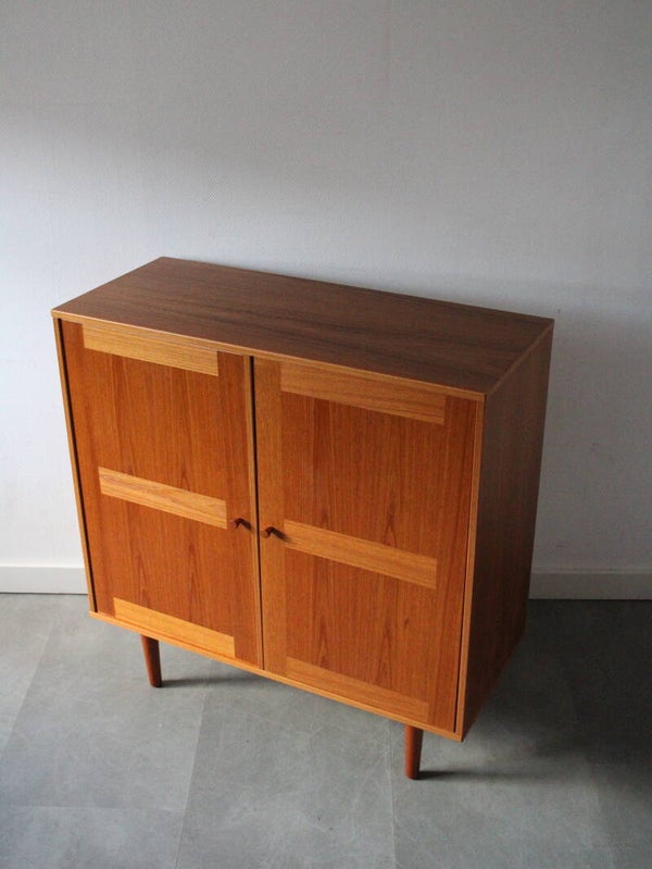 Vintage Deense kast in teakhout, ontworpen door Denka Møbler. Dit elegante meubelstuk is een prachtig voorbeeld van Deens mid-century design. De warme teakkleur en de verfijnde lijnen geven de kast een tijdloze uitstraling, maar wat deze kast écht bijzonder maakt, is het unieke houtpatroon op de deuren. De natuurlijke tekening van het teak vormt een opvallend en karaktervol geheel, zoals je dat alleen ziet bij hoogwaardig Deens vakmanschap.