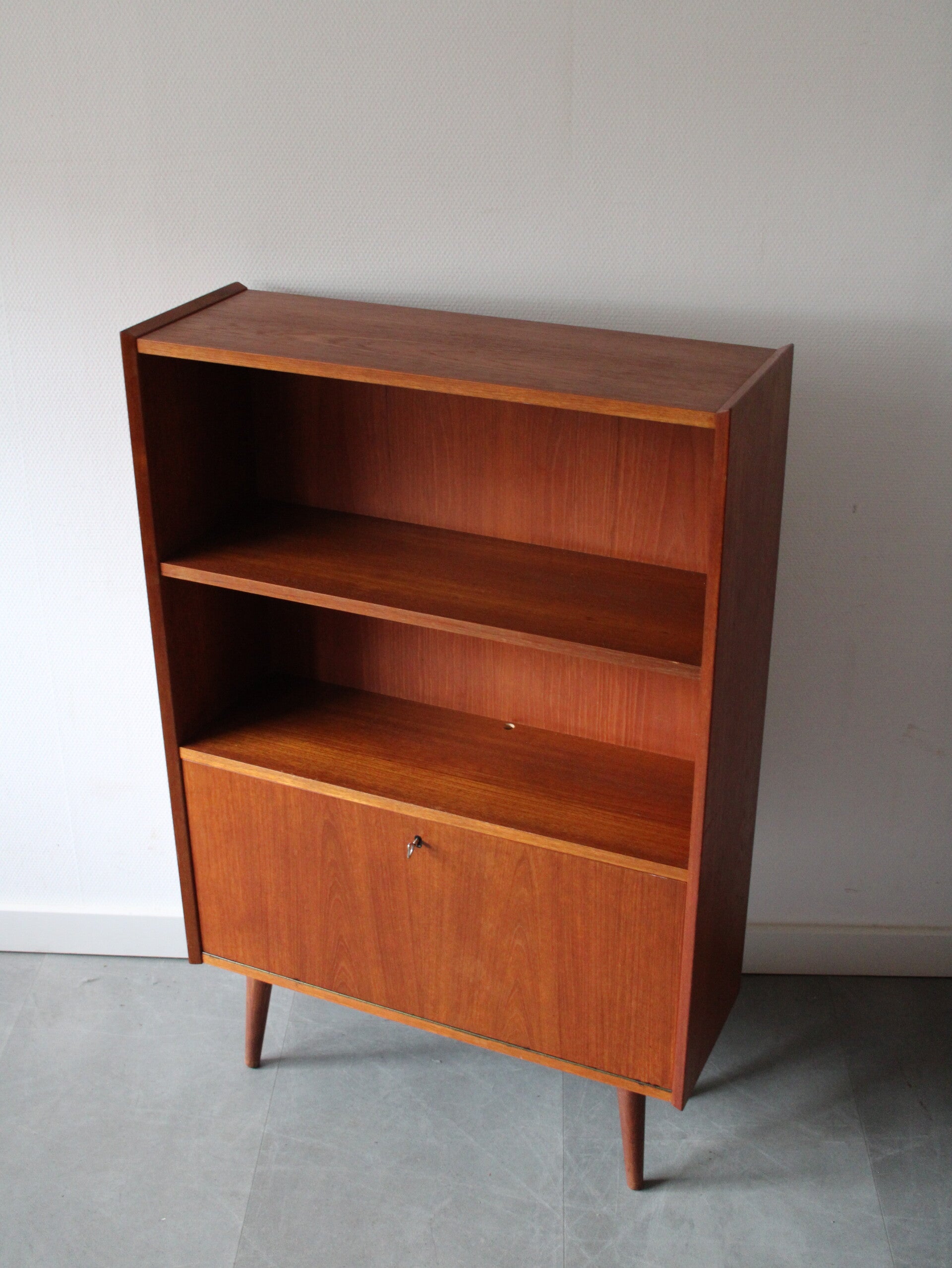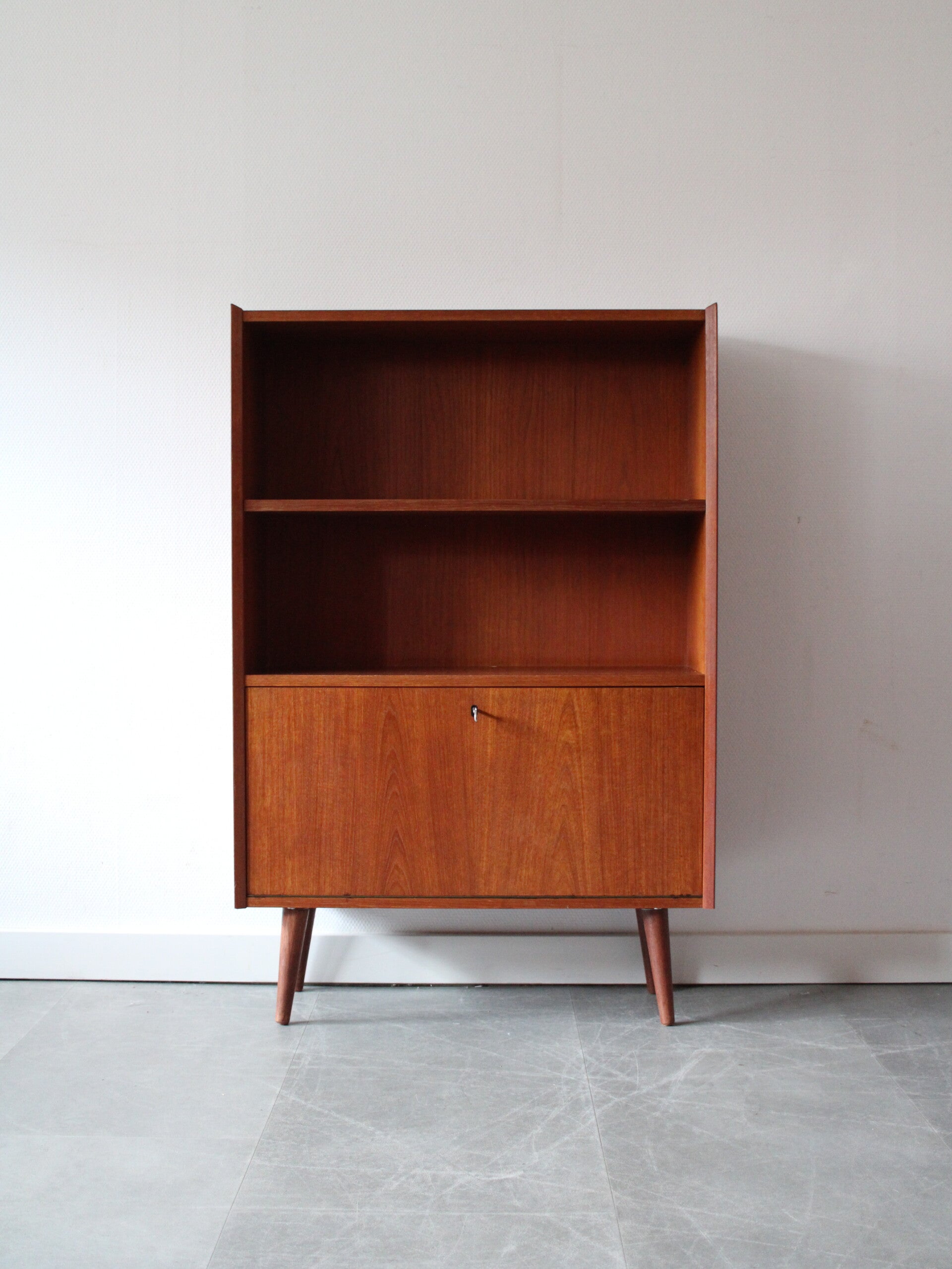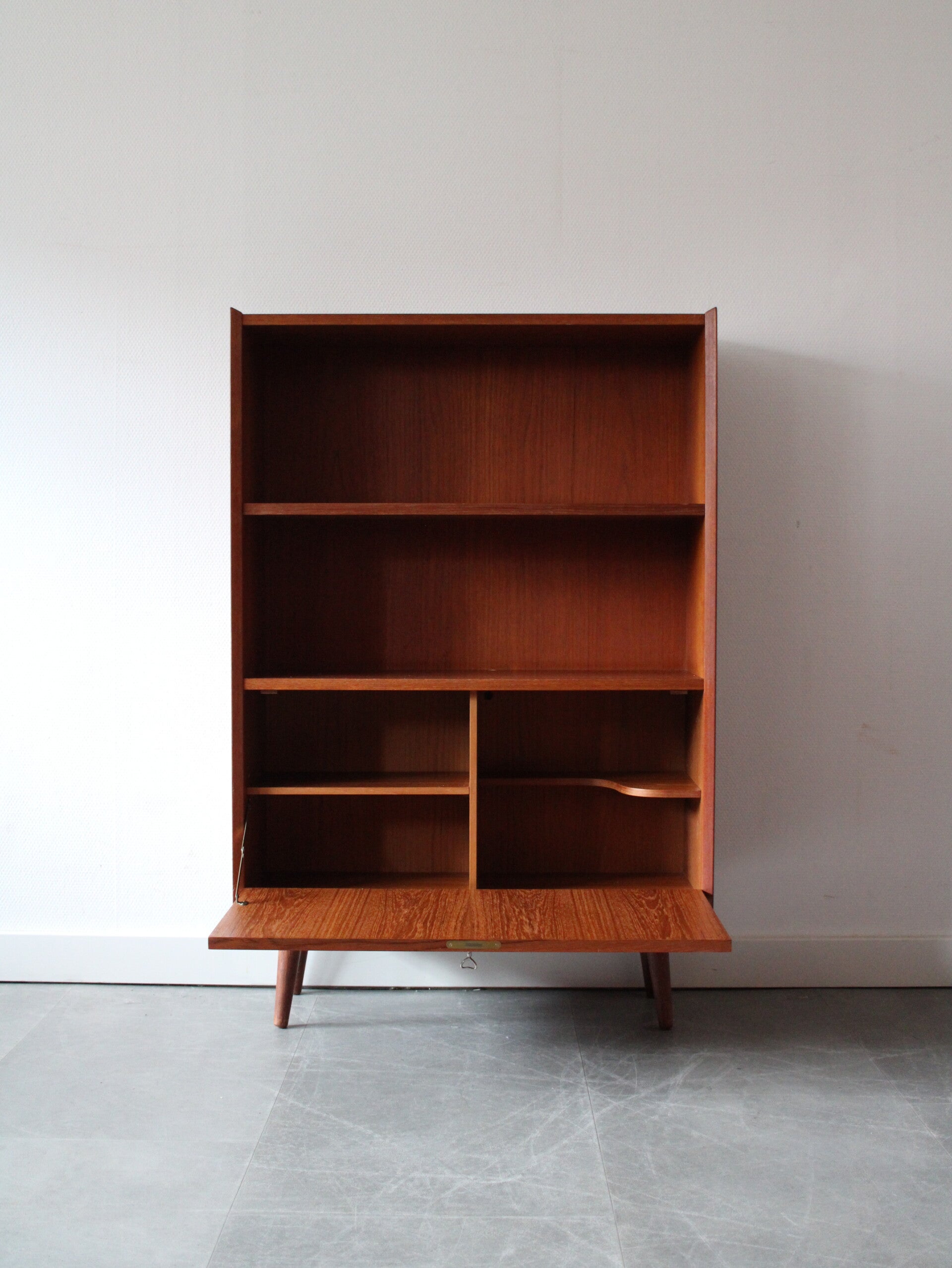 Vintage Deense boekenkast met klep, ontworpen en vervaardigd door Ølholm Møbelfabrik, een Deense meubelmakerij bekend om degelijk vakmanschap en strakke, functionele ontwerpen. De kast is gemaakt van warm teakhout en combineert elegantie met praktische opbergruimte.