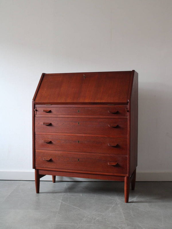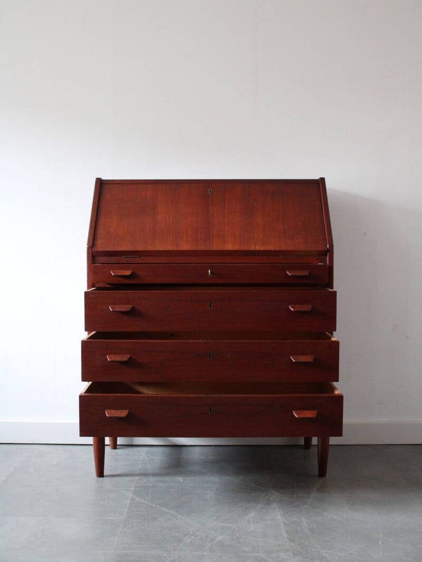 Prachtige vintage Deense secretaire van een onbekende Møbelfabrik, uitgevoerd in hoogwaardig hout met een geweldige afwerking. Kenmerken van Børge Mogensen en Poul M. Volther; twee invloedrijke en toonaangevende Deense ontwerpers. Dit meubel combineert elegantie en is ideaal voor wie een stijlvolle thuiswerkplek wil creëren.