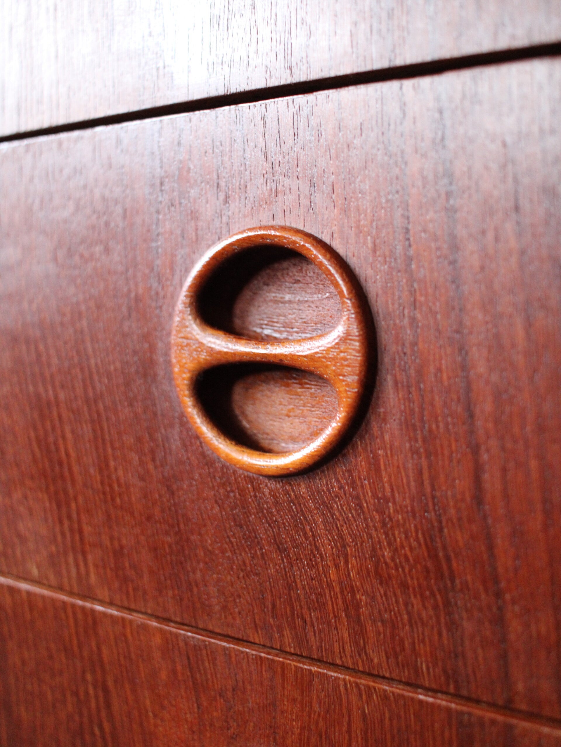 De kast beschikt over vier ruime lades met prachtige ingelegde grepen: subtiel, stijlvol en typisch voor Deens ontwerp uit de jaren ’60. De greepjes zijn strak geïntegreerd in het front, waardoor het meubel een rustig en minimalistisch geheel vormt. Dankzij zijn bescheiden formaat is dit een ideale kast voor in de woonkamer, slaapkamer, hal of werkkamer.