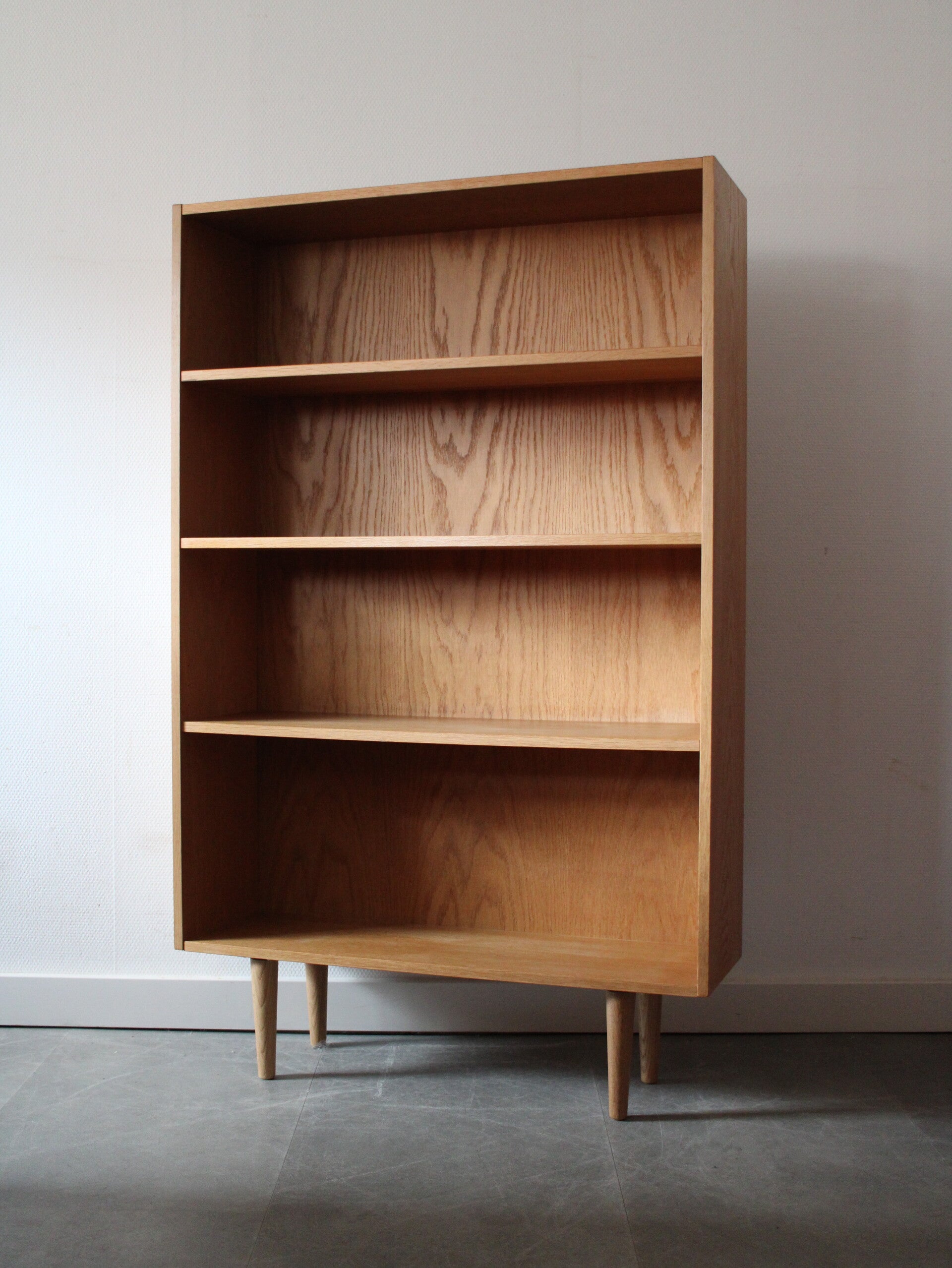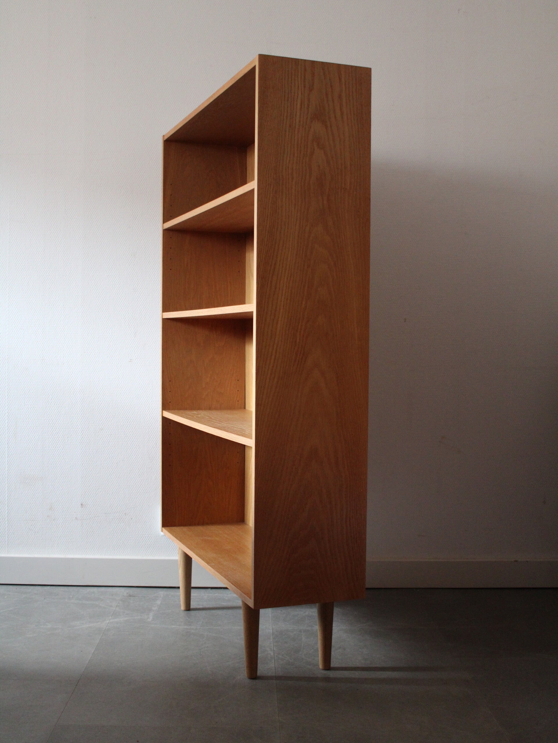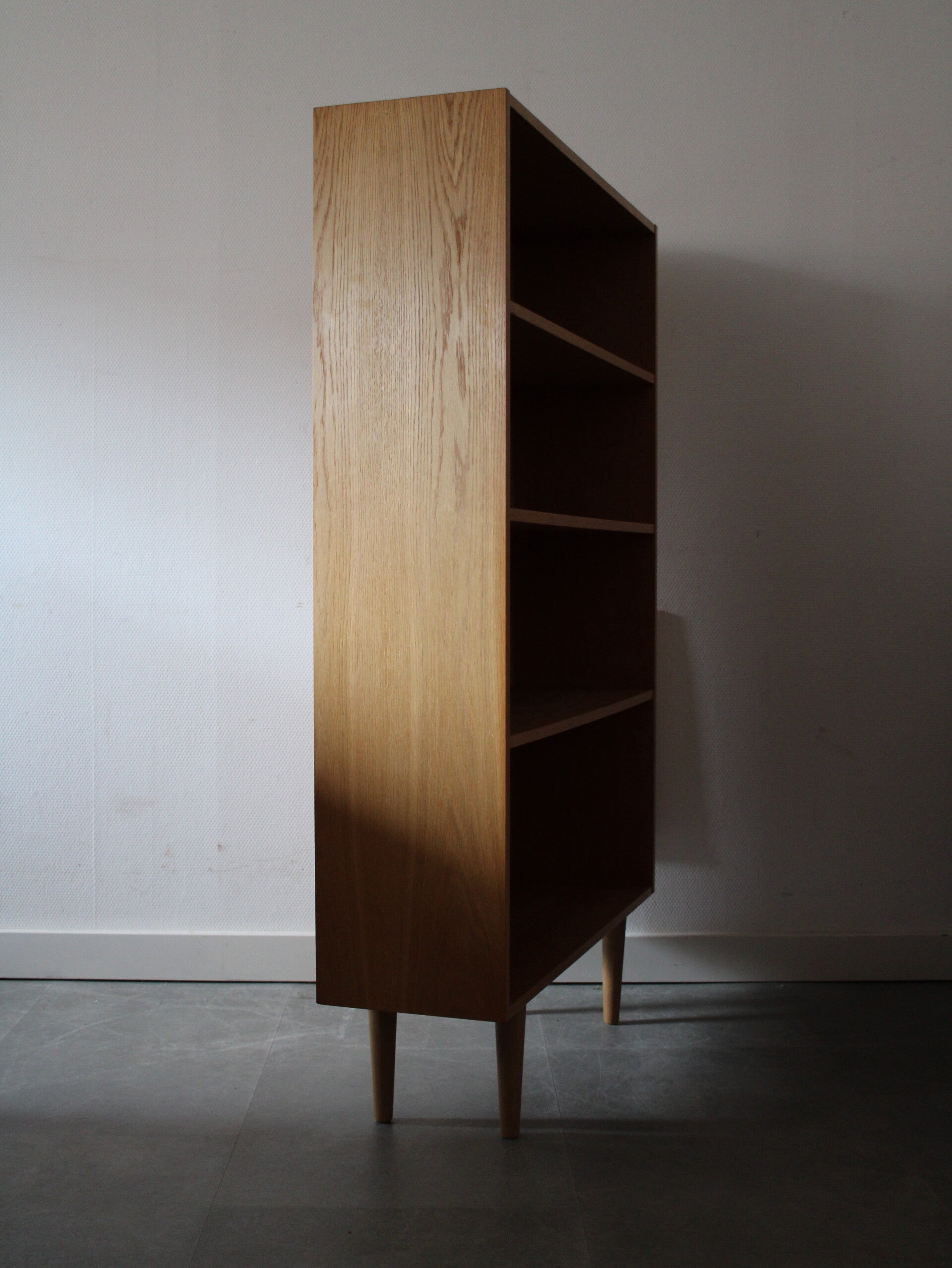 Vintage Deense boekenkast in eiken, een prachtig voorbeeld van functioneel en tijdloos Deens design. De kast heeft een elegante, slanke vorm en is uitgevoerd in warm teak, waardoor het meubel een verfijnde en natuurlijke uitstraling krijgt.