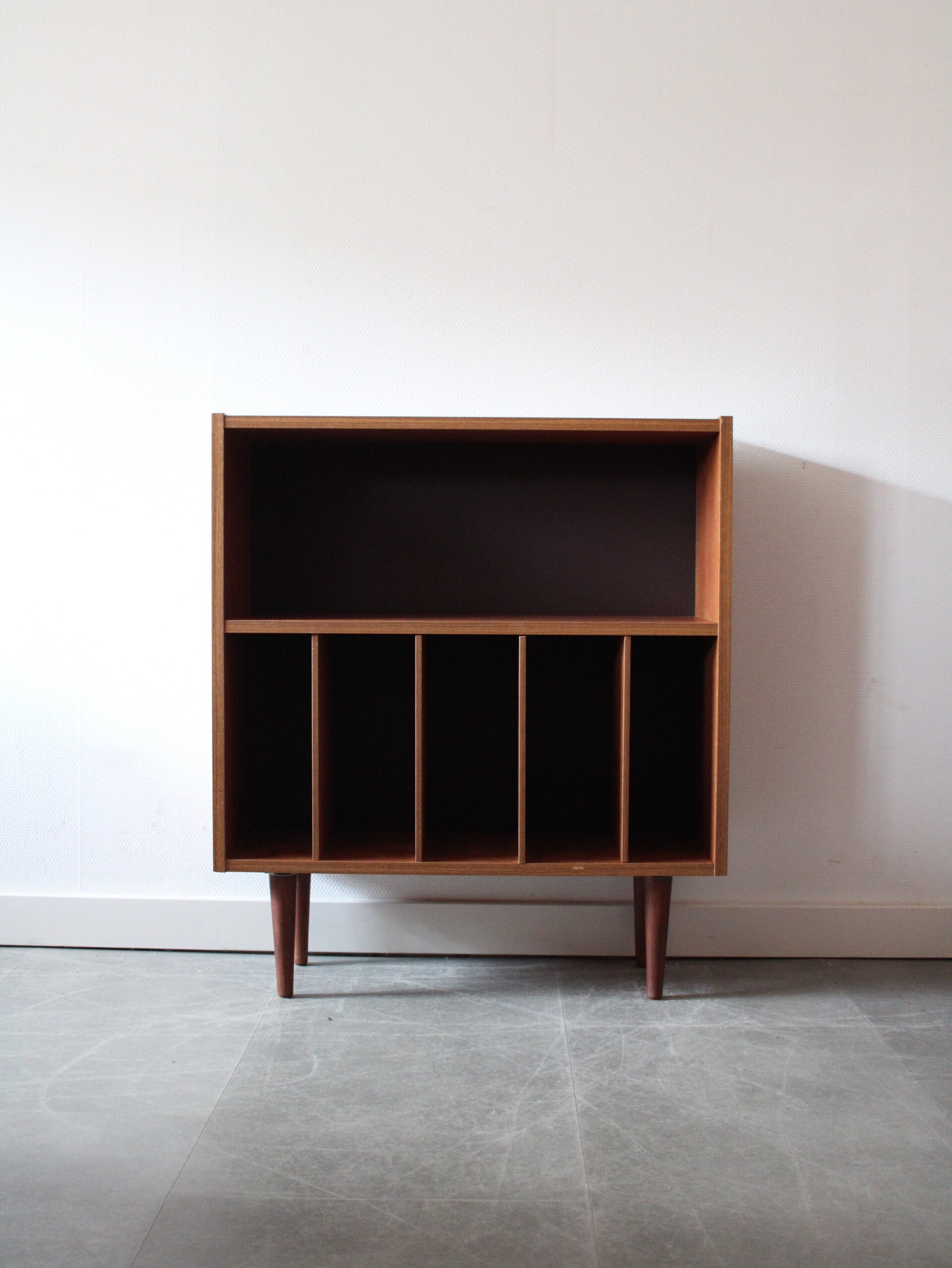 De kast beschikt over vijf vakken, speciaal geschikt voor het opbergen van LP’s en singles, met een diepte van ongeveer 26 cm. Zo blijven je platen overzichtelijk, netjes en gemakkelijk toegankelijk. Tevens zijn de vakken te verbreden door de plank te verwijderen. De strakke lijnen en minimalistische vormgeving maken het meubel veelzijdig en passend in zowel moderne als vintage interieurs.