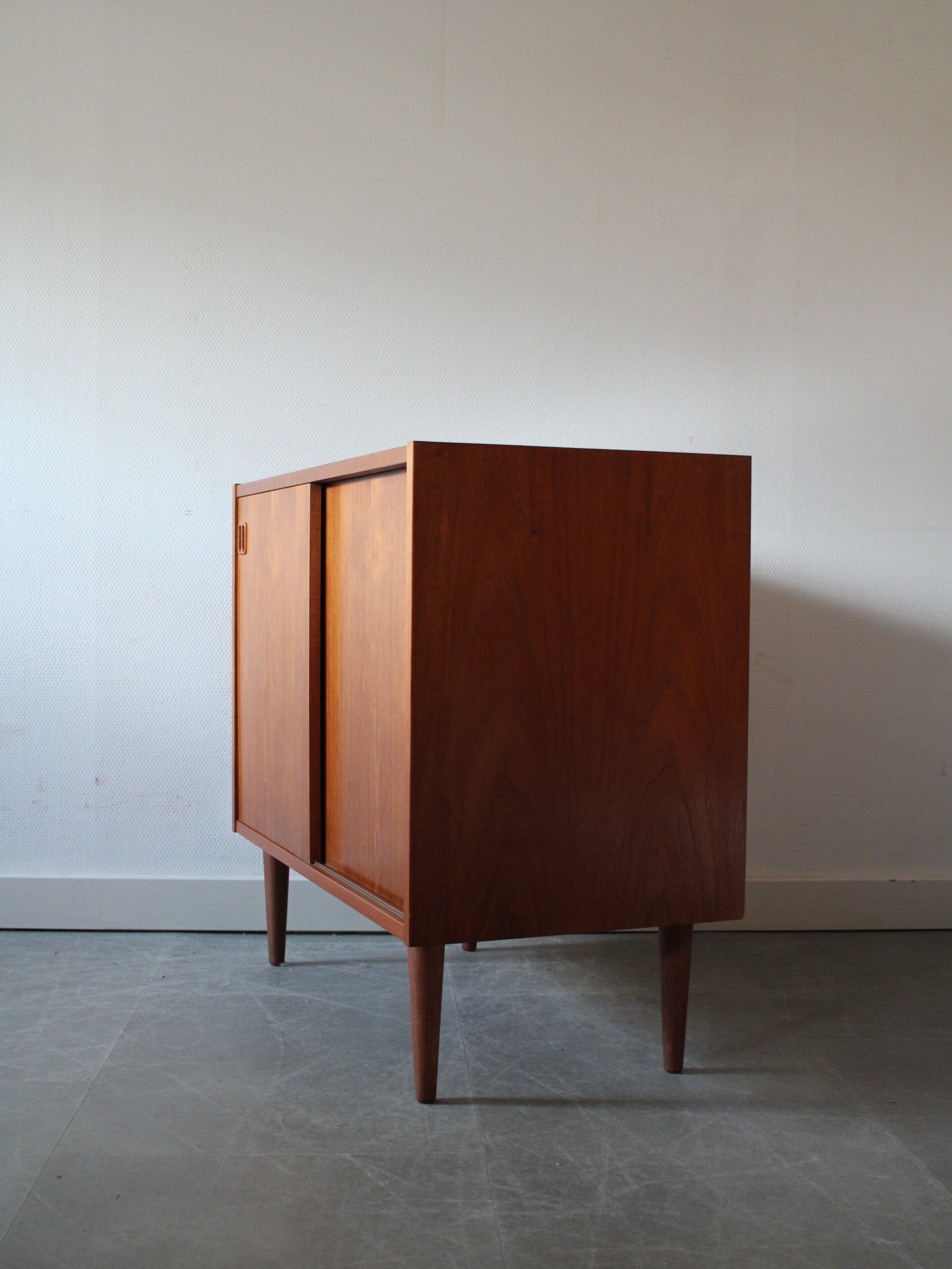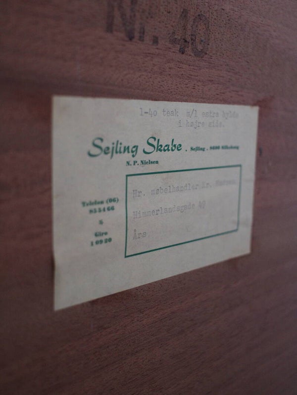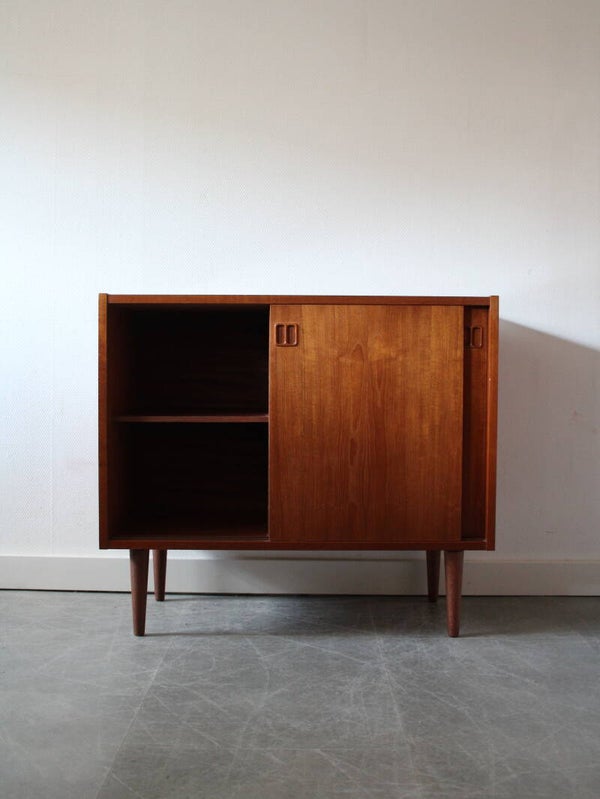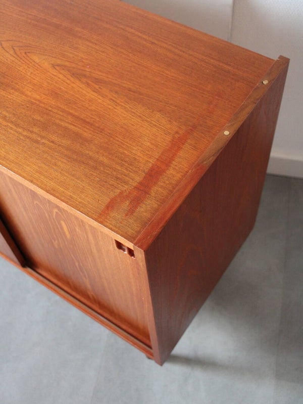 Vintage Deens dressoir met twee schuifdeuren. Dit stijlvolle dressoir is ontworpen door N.P. Nielsen voor Sejling Skabe, een Deense meubelfabrikant, en weerspiegelt de hoge kwaliteit en verfijnde afwerking waar Scandinavisch design om bekendstaat. Het gebruik van teak en de mate van afwerking onderstrepen de duurzaamheid en tijdloze uitstraling van dit meubelstuk.