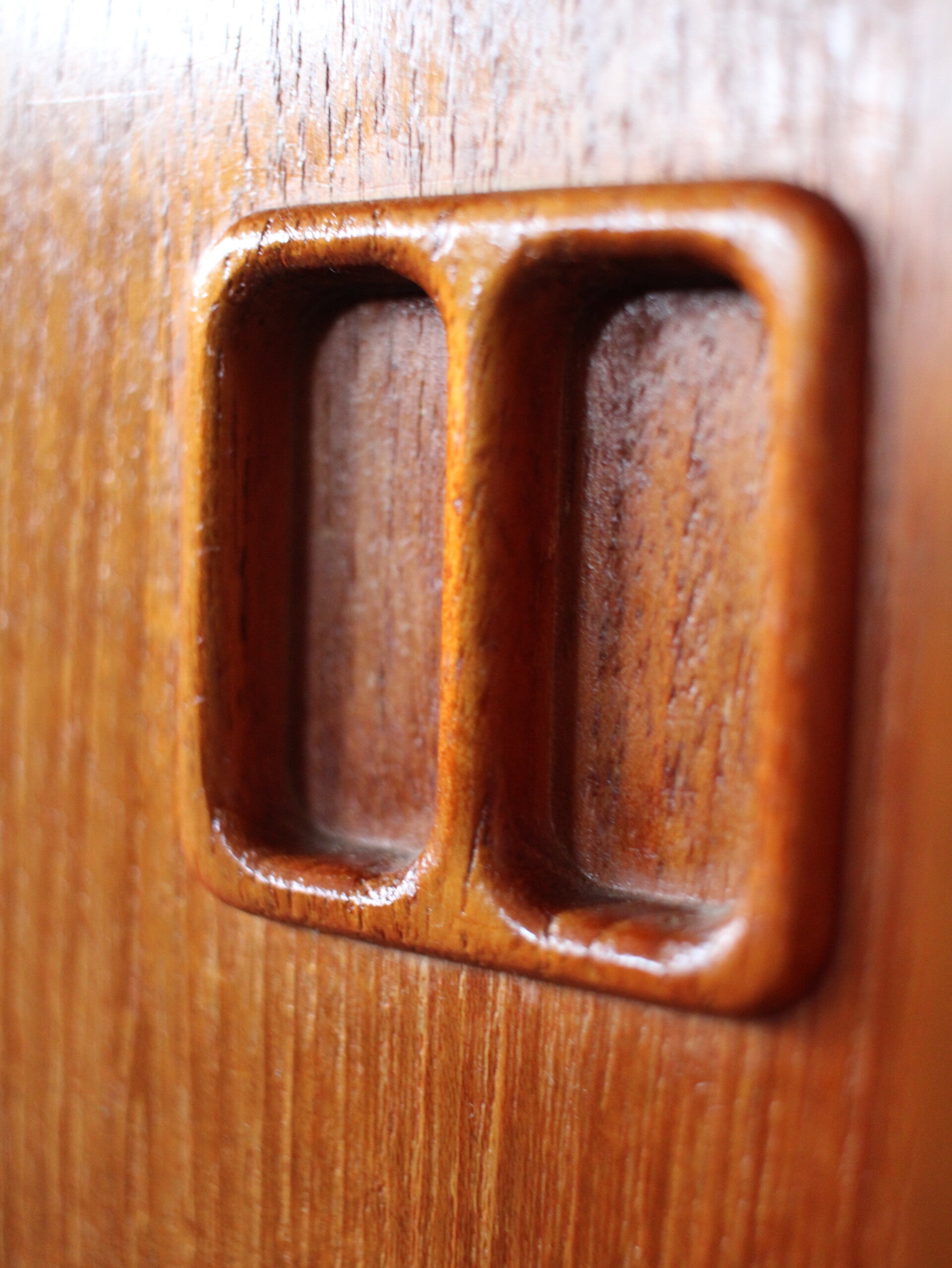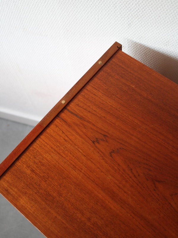 De kast is behandeld met Deense olie en zorgvuldig gepoetst, waardoor het hout zijn warme glans volledig behoudt. Het meubel verkeert in zeer goede staat, met nauwelijks zichtbare gebruikssporen. Aan de bovenzijde is een vlek zichtbaar, zoals te zien op de foto.