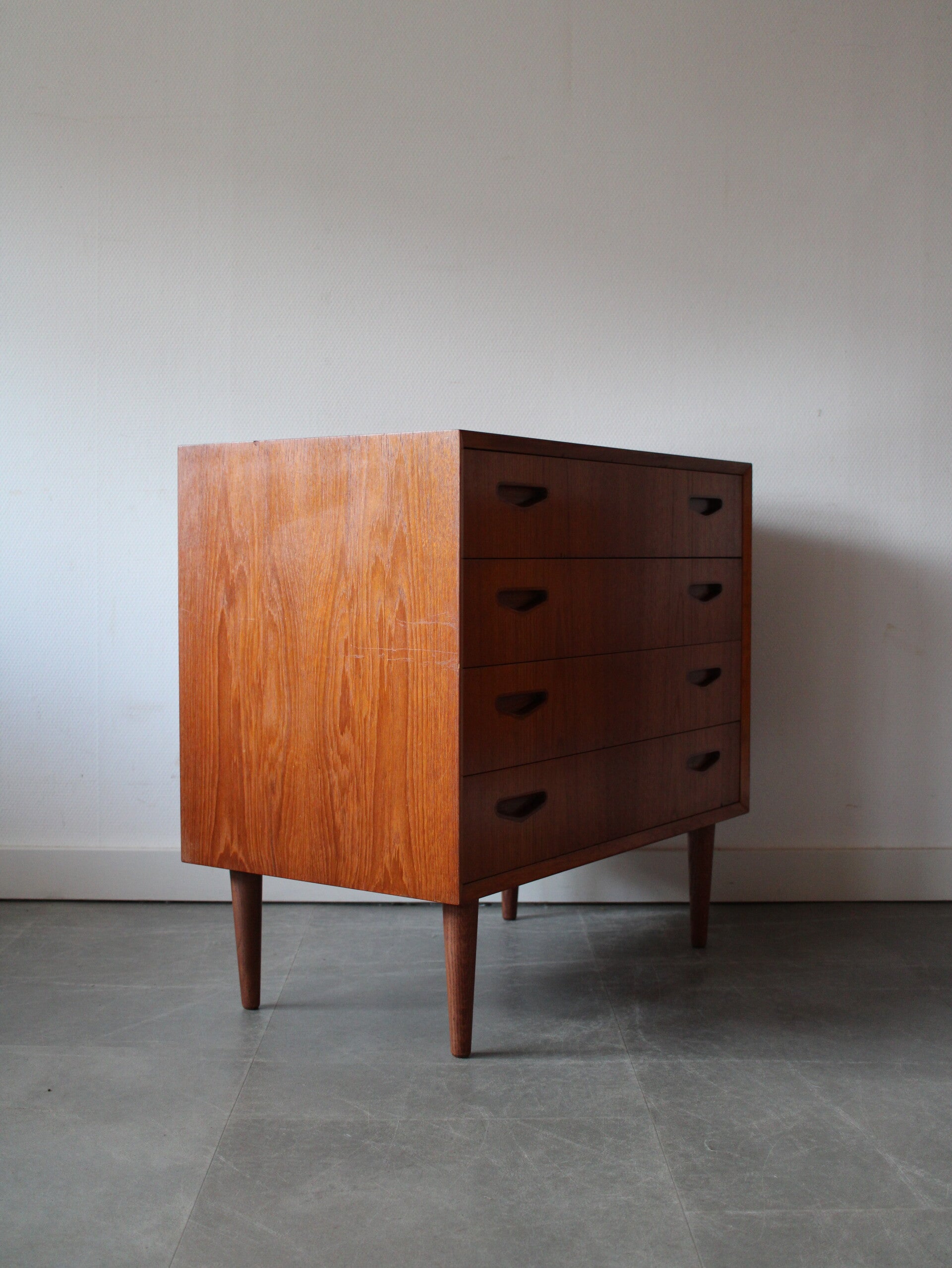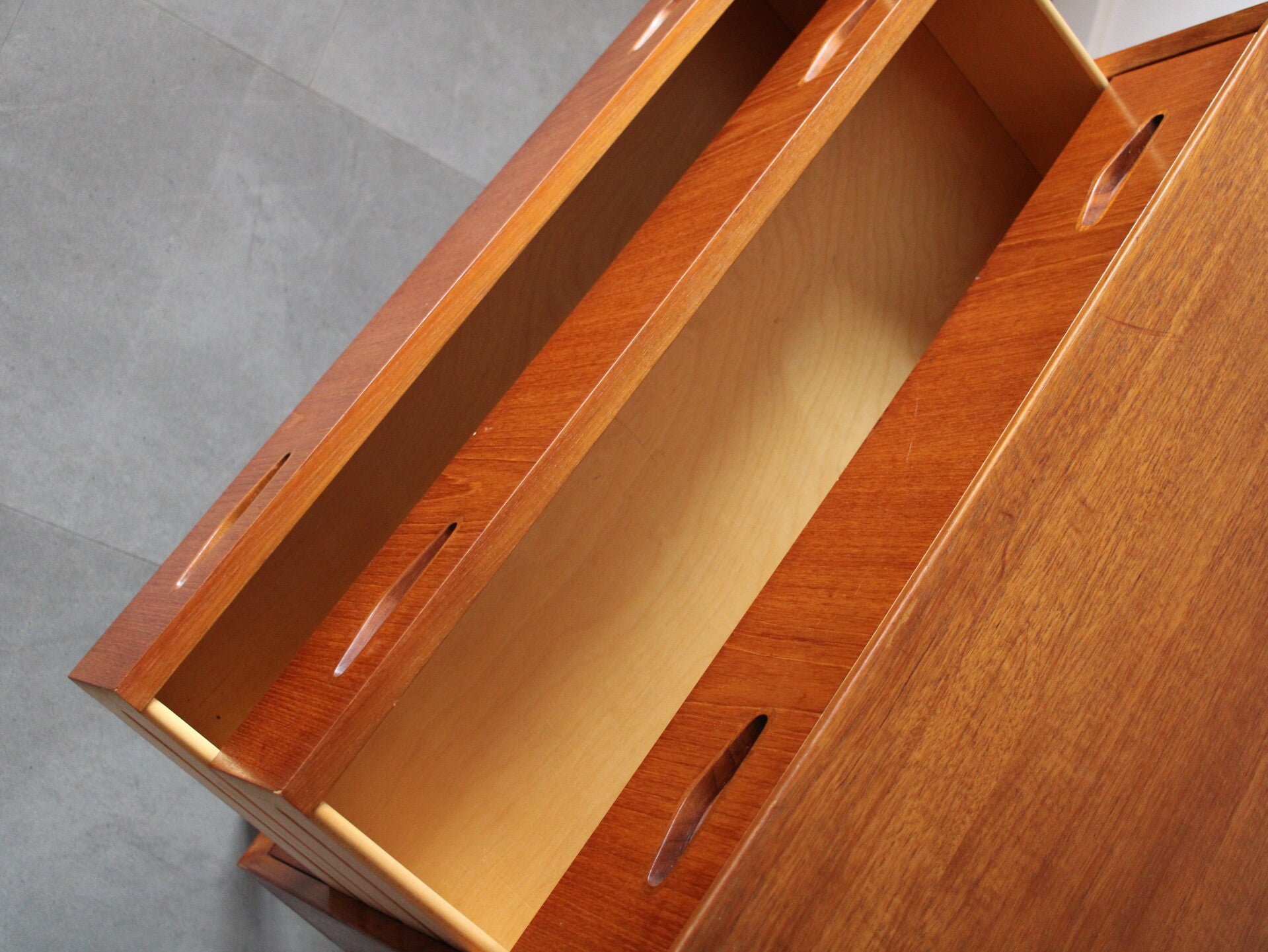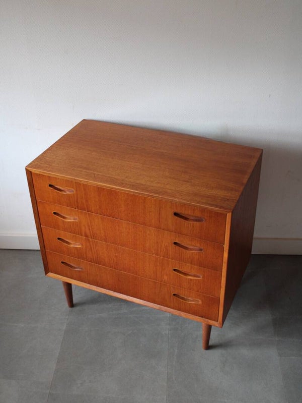 Vintage ladekast in teak van Ølholm Møbelfabrik, geproduceerd in Denemarken. Deze kast dateert uit de jaren 60 en is een mooi voorbeeld van strak Scandinavisch design: tijdloos, warm en functioneel.