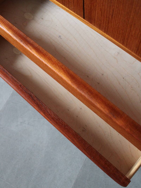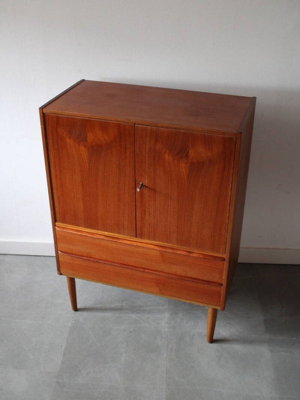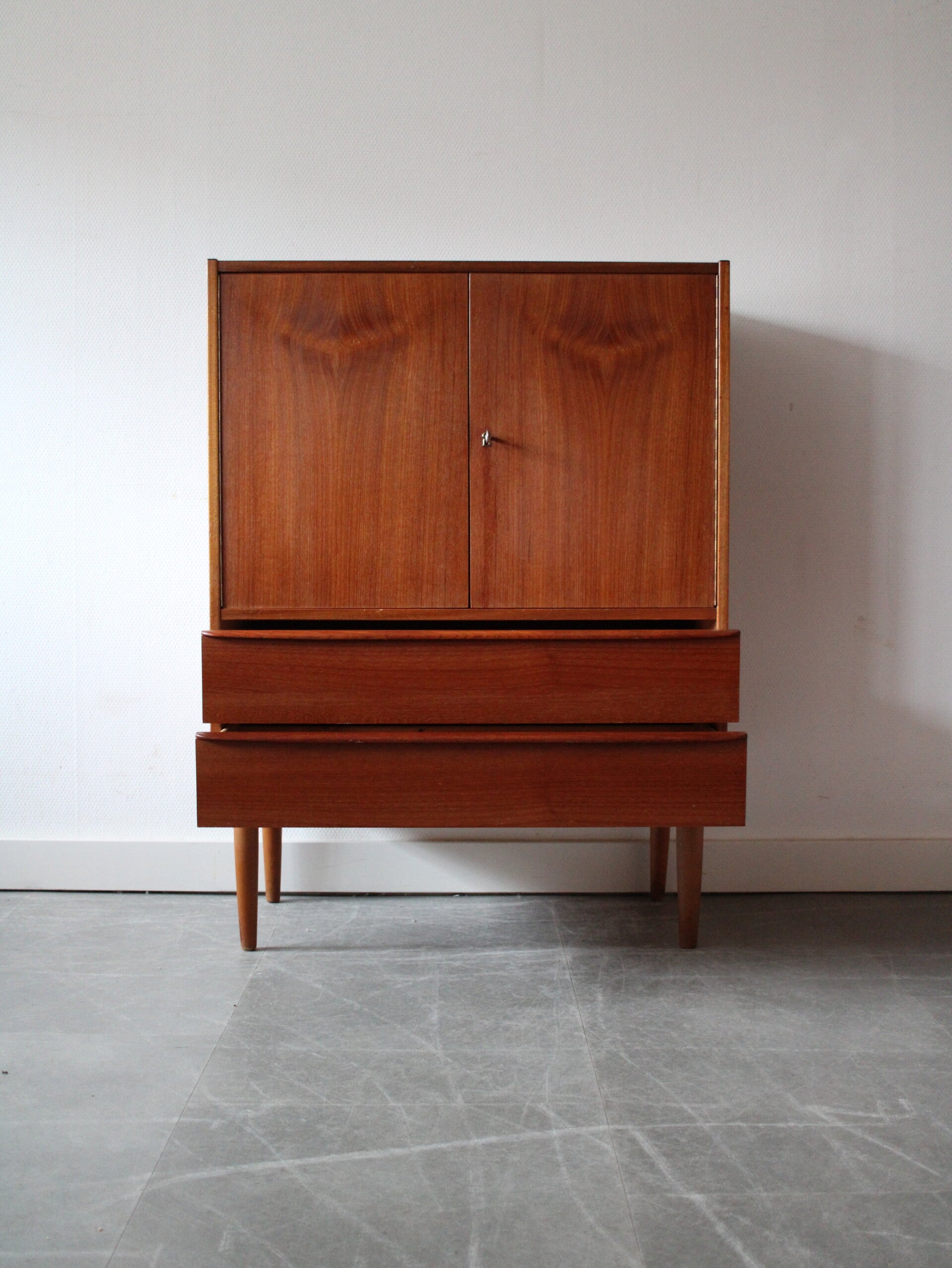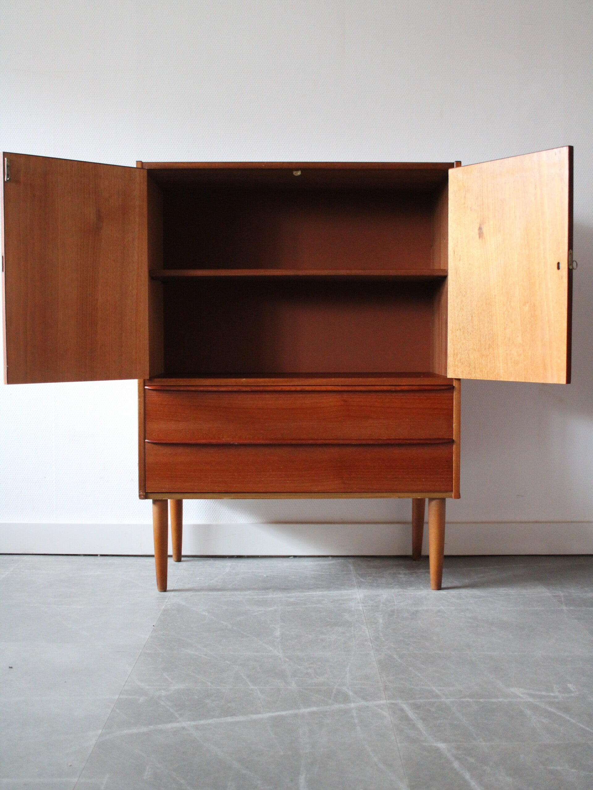 Vintage kast in teak, geproduceerd in Scandinavië, daterend uit de jaren 60. Het meubel is uitgevoerd in een strak en tijdloos Scandinavisch ontwerp met warme houttinten en een fraaie nerftekening.