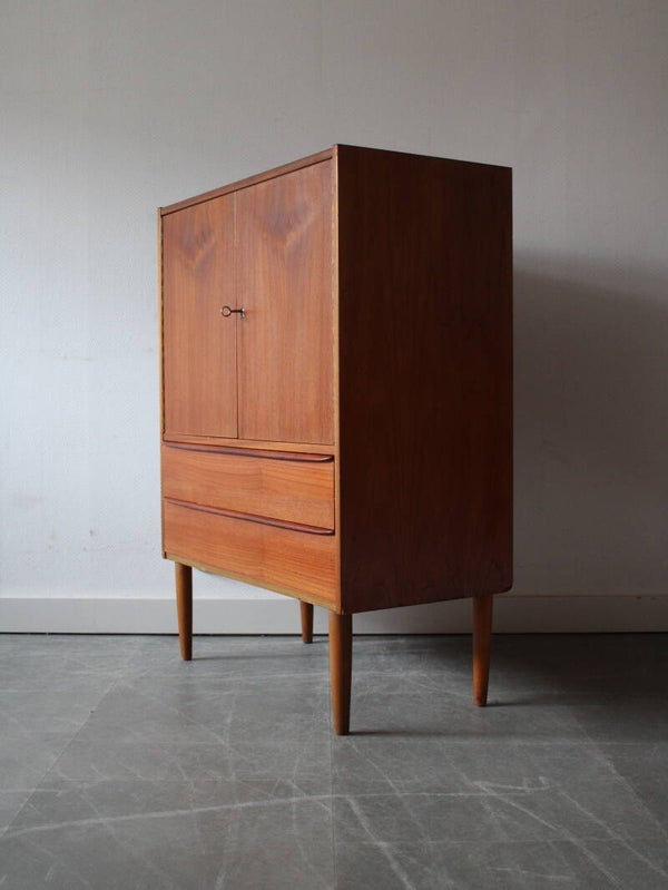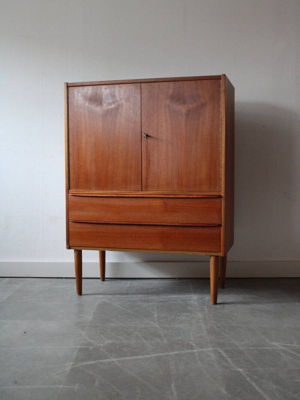 De kast beschikt over een bovenkast met twee deuren en daaronder twee soepel lopende lades, wat zorgt voor praktische opbergruimte. De deuren zijn voorzien van een subtiele originele greep. Het meubel staat op slanke, taps toelopende poten, wat bijdraagt aan de luchtige en elegante uitstraling.