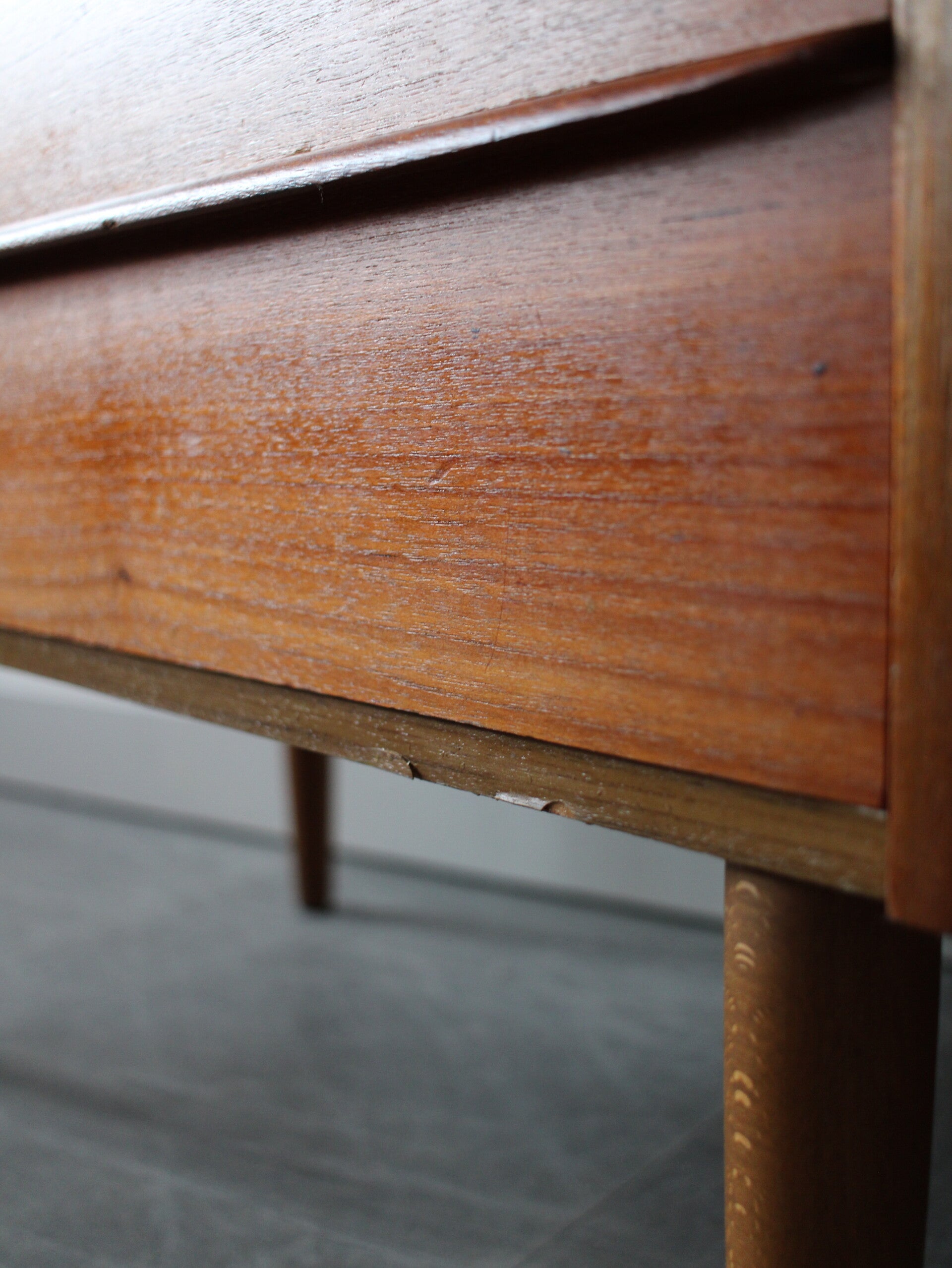 De kast is gereinigd, gepoetst en behandeld met een passende Deense olie, waarna deze opnieuw is gepoetst. Er zijn zichtbare gebruikerssporen en lichte beschadigingen aanwezig, passend bij de leeftijd. Deze zijn zichtbaar op de foto’s en geven het meubel een authentiek vintage karakter.