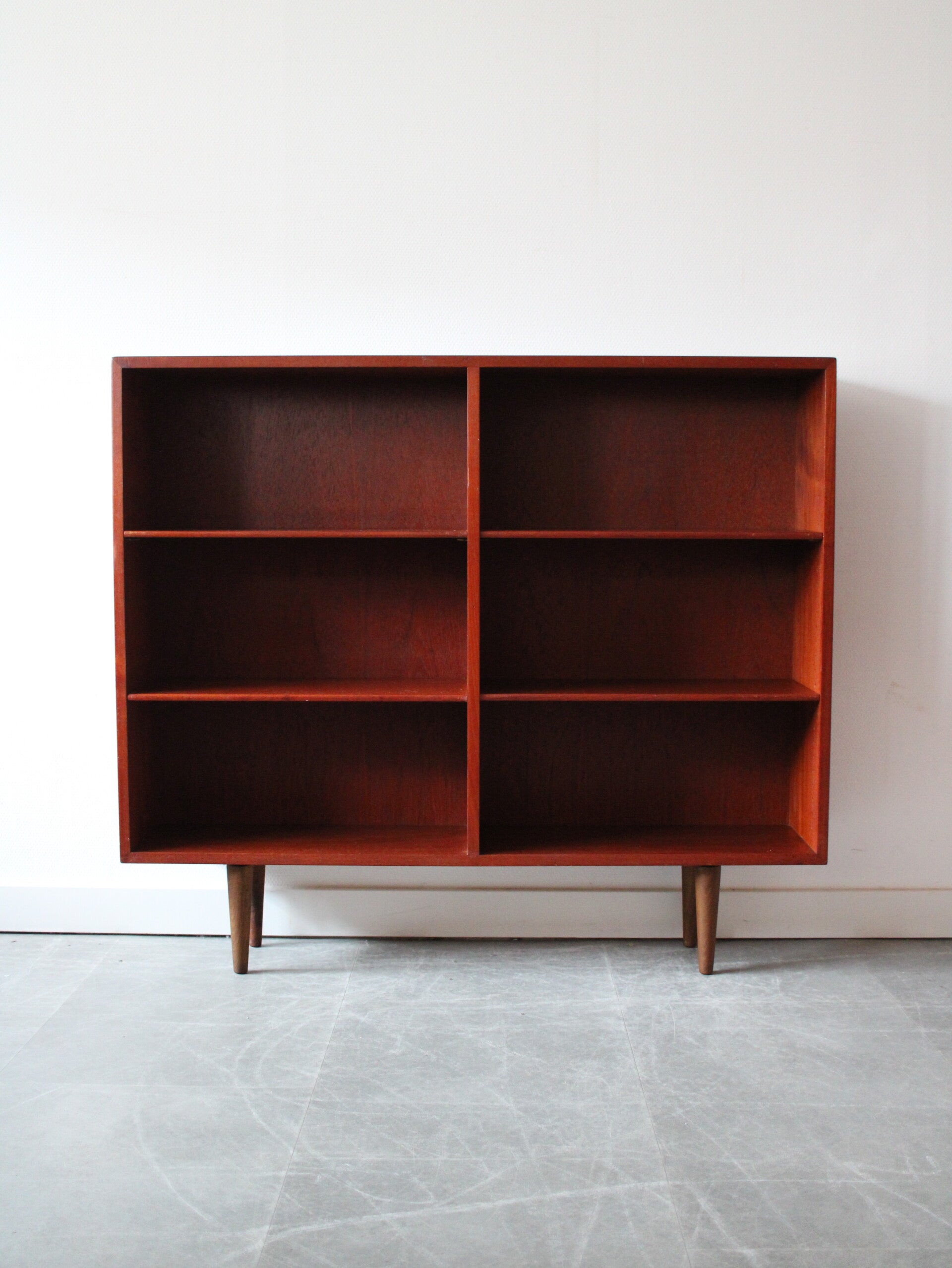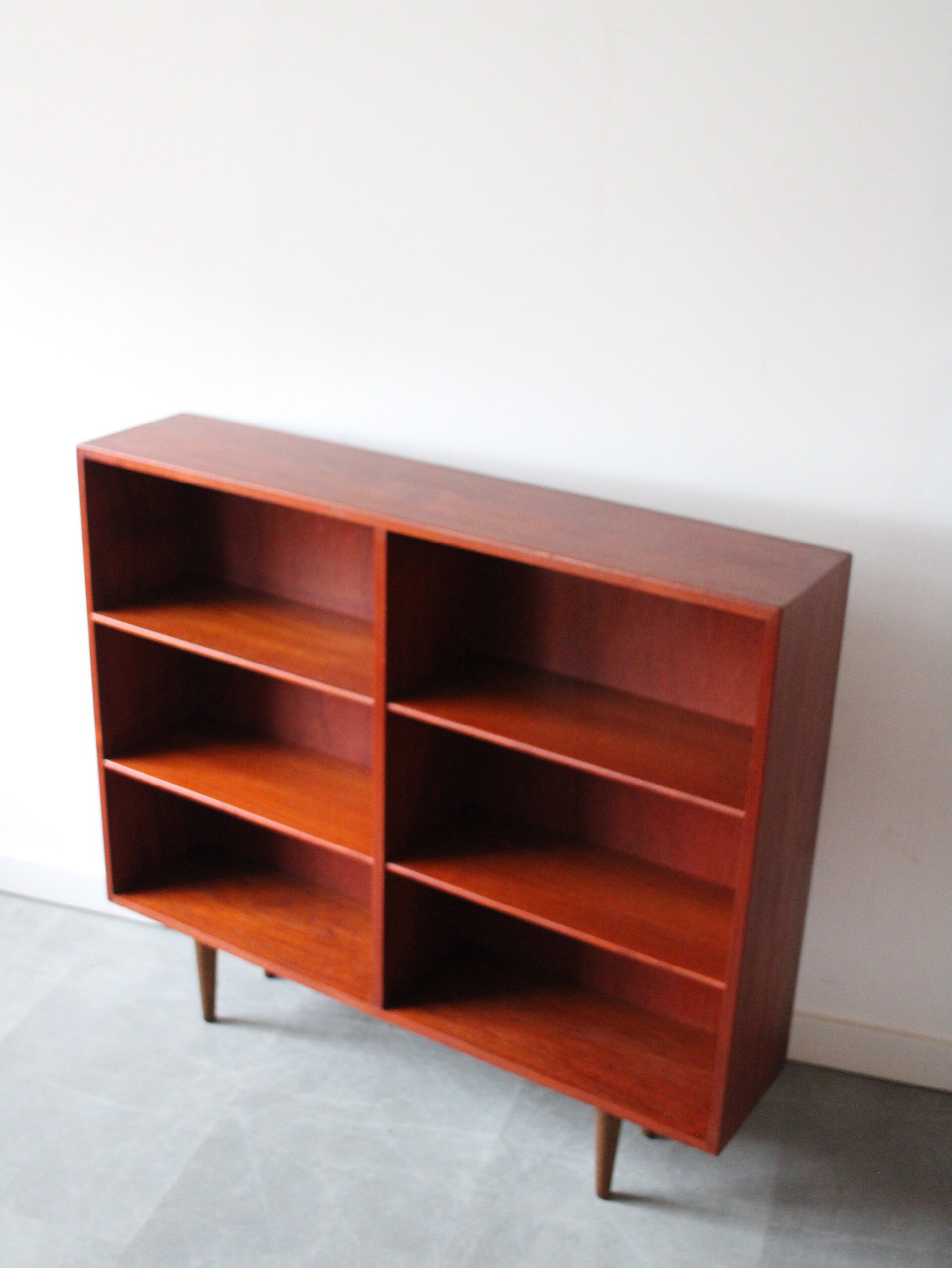 De kast is uitgevoerd in warm teak en beschikt over vier open vakken met in hoogte verstelbare planken. Hierdoor is het meubel flexibel in te delen en geschikt voor het opbergen en presenteren van boeken, platen of decoratieve objecten van verschillende formaten. Dankzij de compacte diepte en uitgebalanceerde proporties past deze kast moeiteloos in zowel moderne als vintage interieurs.