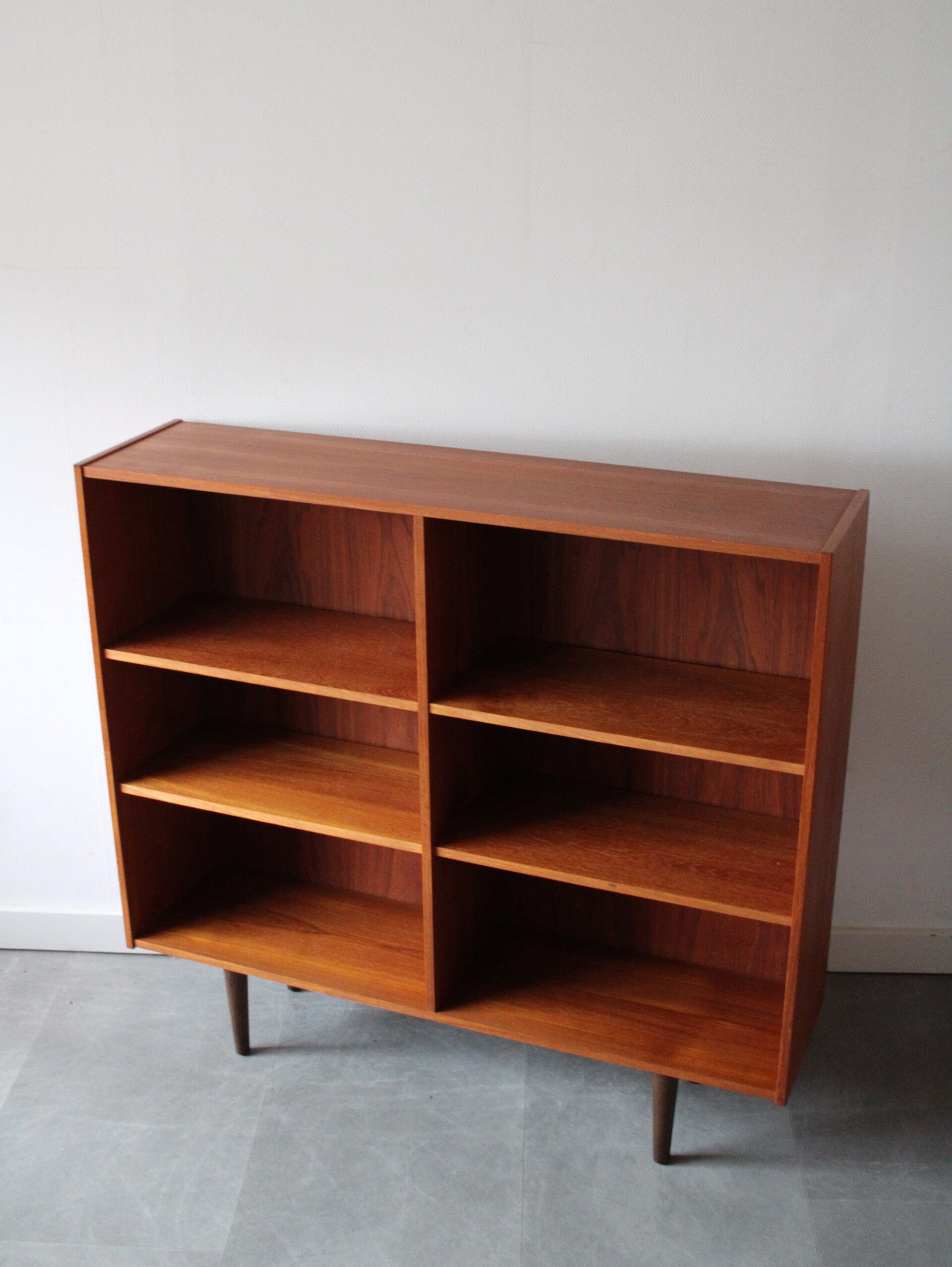 De kast is uitgevoerd in warm teak en beschikt over vier open vakken met in hoogte verstelbare planken. Hierdoor is het meubel flexibel in te delen en geschikt voor het opbergen en presenteren van boeken, platen of decoratieve objecten van verschillende formaten. Dankzij de compacte diepte en uitgebalanceerde proporties past deze kast moeiteloos in zowel moderne als vintage interieurs.