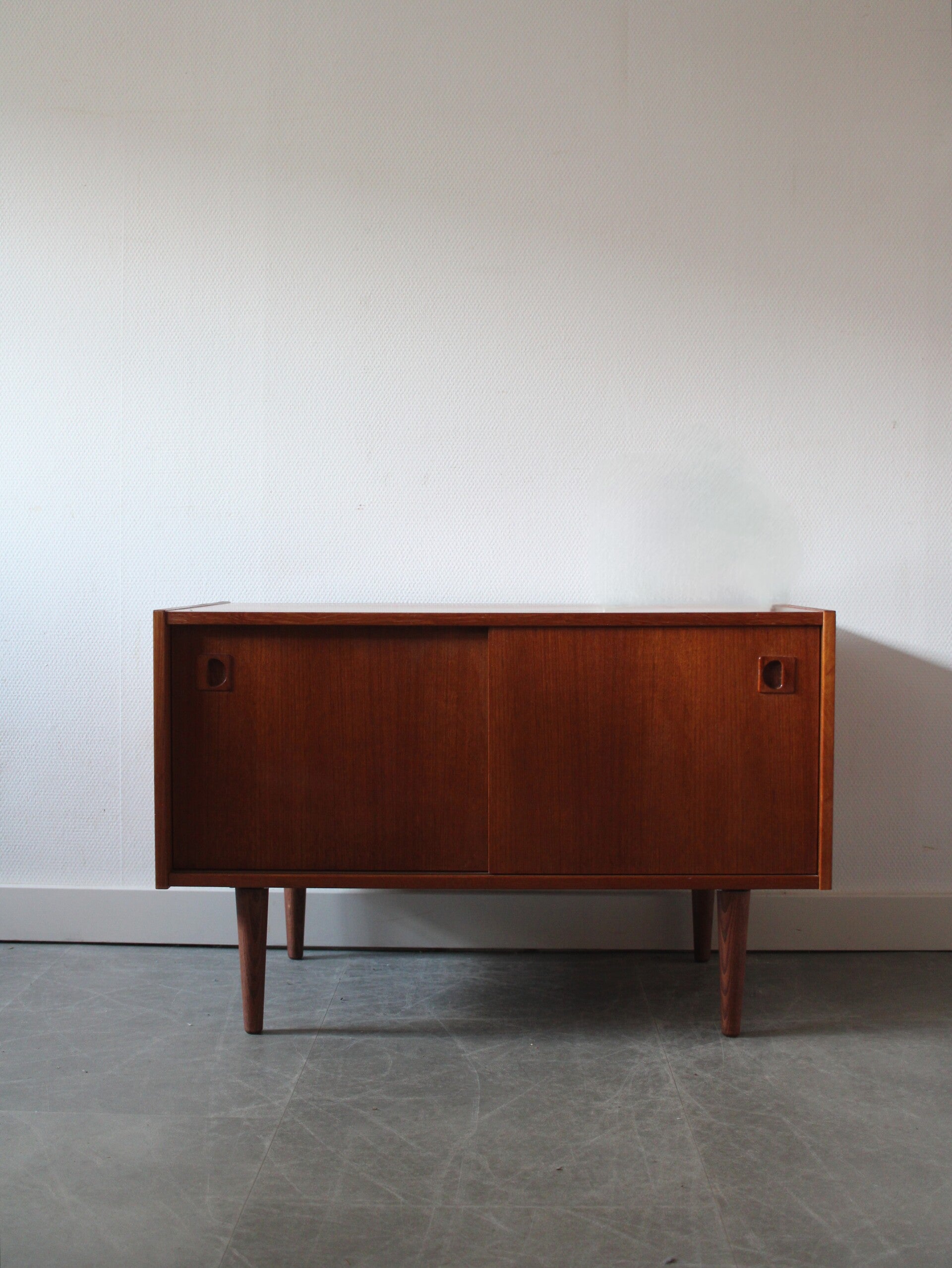 Vintage Deens dressoir in teak, geproduceerd in Denemarken. Deze kast dateert uit de jaren 60 van de vorige eeuw en is uitgevoerd in een strak en tijdloos Scandinavisch ontwerp.