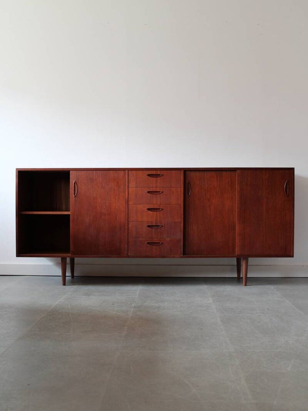 Vintage Deens dressoir in teak, een prachtig voorbeeld van functioneel en tijdloos Deens design. Het dressoir is gemaakt door onbekende Deense Møbelfabrik. De kast is uitgevoerd in warm teak, waardoor het meubel een verfijnde en natuurlijke uitstraling krijgt.