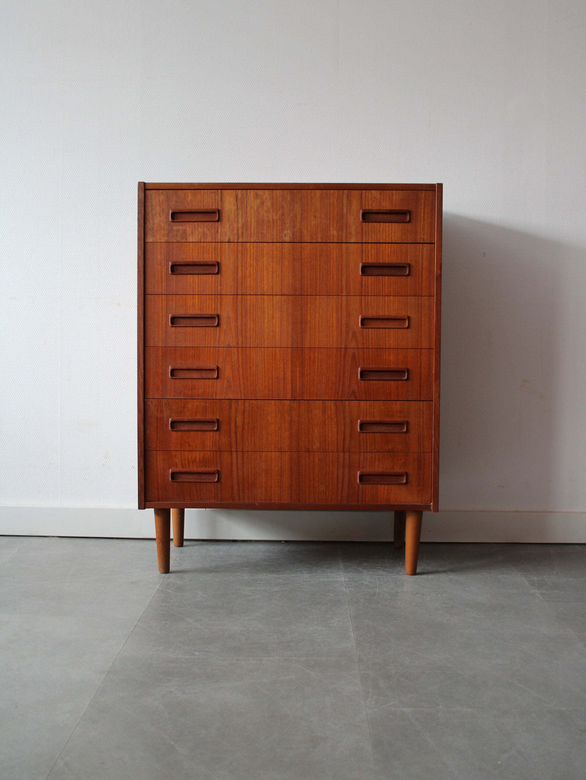 Deze ladekast heeft maar liefst zes soepel lopende lades met massieve houten grepen, strak en tijdloos vormgegeven. Het geheel rust stevig op taps toelopende poten, wat de kast een luchtige en elegante uitstraling geeft.