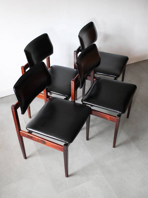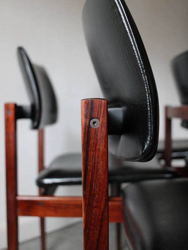 Deze stoelen kenmerken zich door hun warme palissanderhout, strakke belijning en comfortabele zit. Het contrast tussen het rijke hout en de zwarte skai‑leren bekleding geeft de stoelen een rustige maar uitgesproken uitstraling. Dankzij de uitgebalanceerde proporties en ingetogen vormgeving zijn ze zeer geschikt voor gebruik aan een eettafel, zowel in een modern als een vintage interieur.